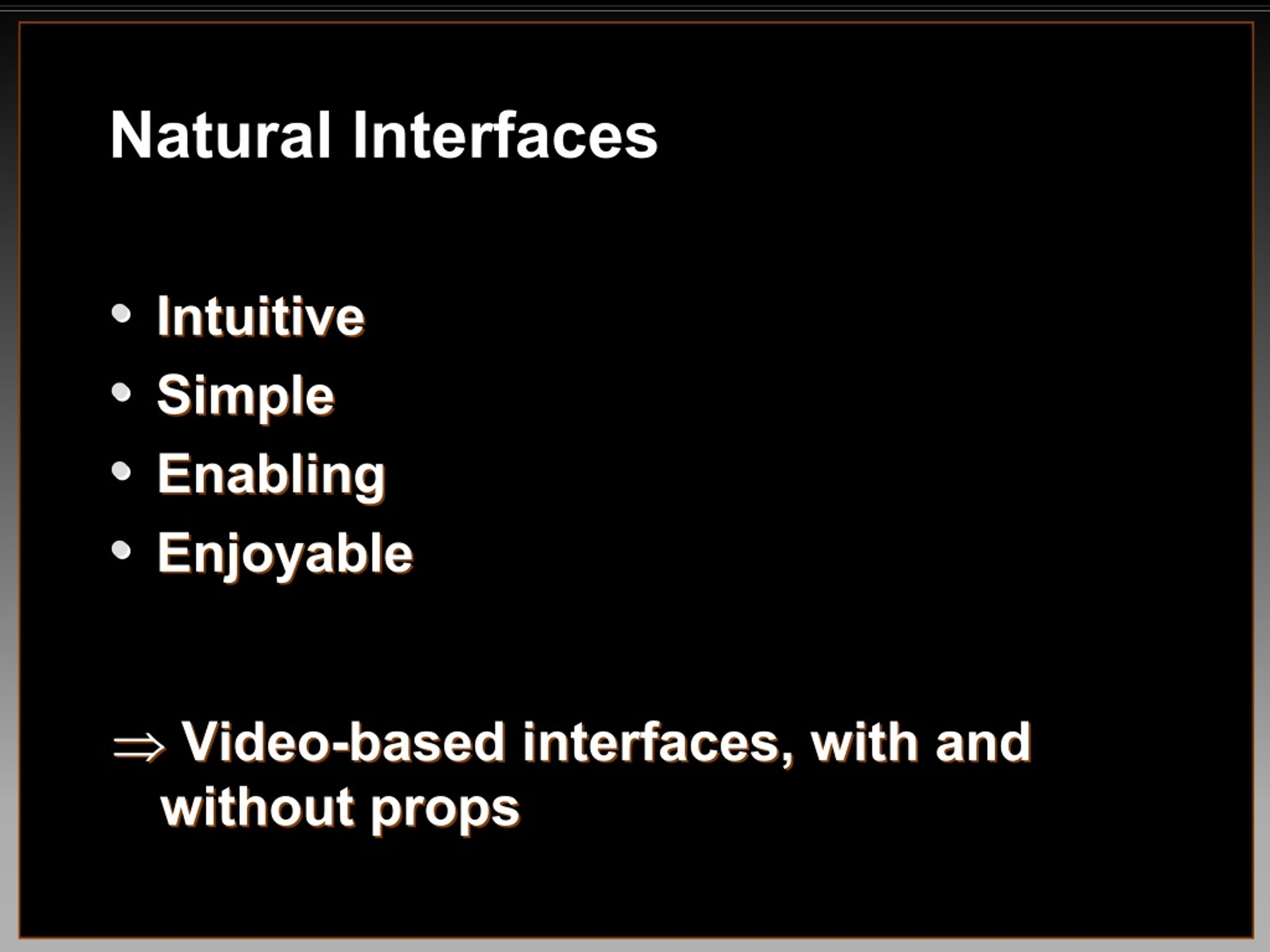 Natural Interfaces • • Intuitive Intuitive • • Simple Simple • • Enabling Enabling • • Enjoyable Enjoyable ⇒ ⇒ ⇒ ⇒ Video Video- -based interfaces, with and based interfaces, with and without props without props