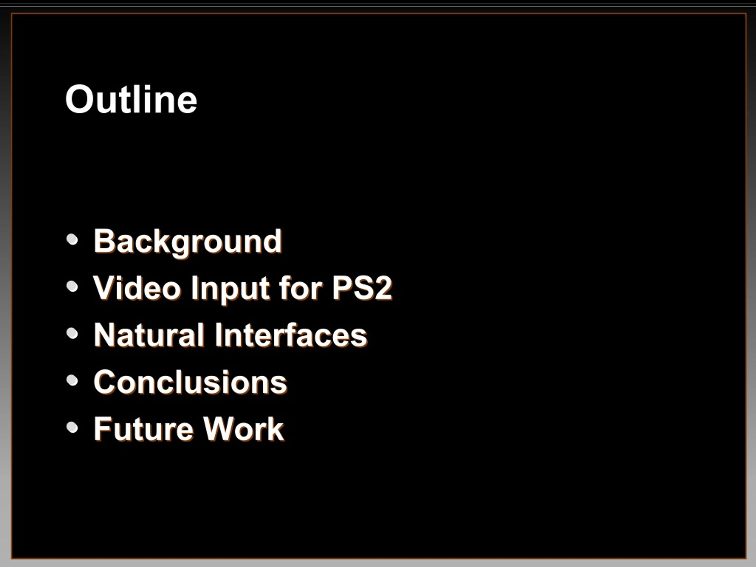 Outline • • Background Background • • Video Input for PS2 Video Input for PS2 • • Natural Interfaces Natural Interfaces • • Conclusions Conclusions • • Future Work Future Work