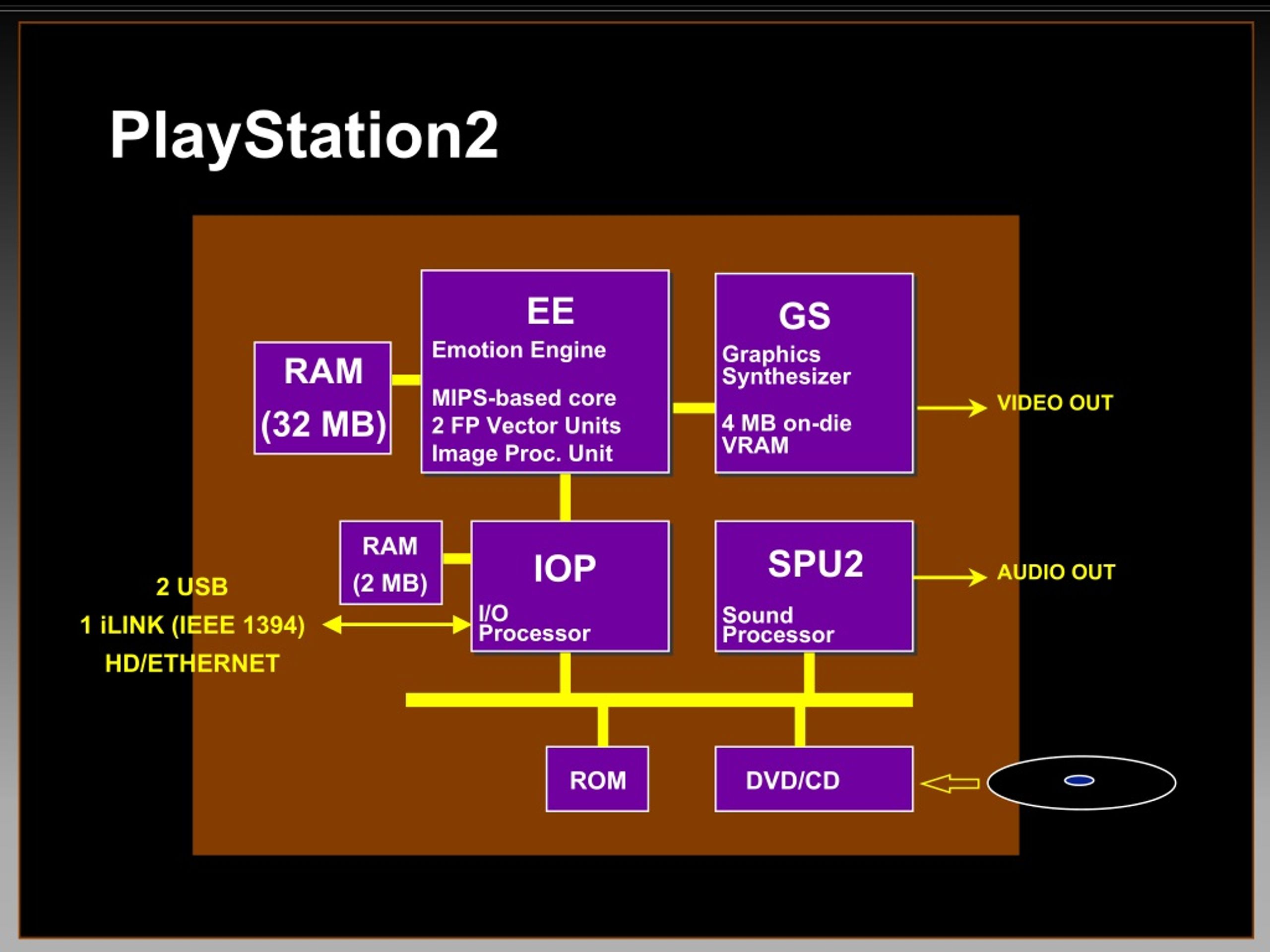 PlayStation2 EE GS Emotion Engine Graphics Synthesizer RAM (32 MB) MIPS-based core 2 FP Vector Units Image Proc. Unit VIDEO OUT 4 MB on-die VRAM RAM (2 MB) SPU2 IOP AUDIO OUT 2 USB I/O Processor Sound Processor 1 iLINK (IEEE 1394) HD/ETHERNET ROM DVD/CD