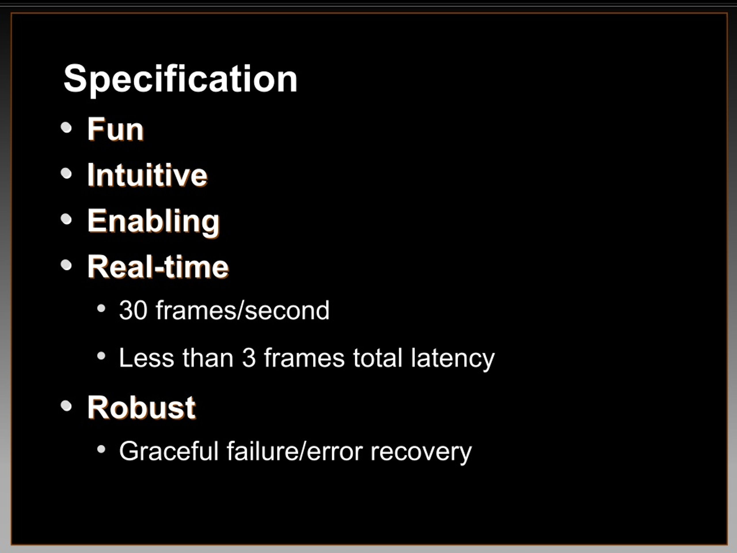 Specification • • Fun Fun • • Intuitive Intuitive • • Enabling Enabling • • Real Real- -time time • 30 frames/second • Less than 3 frames total latency • • Robust Robust • Graceful failure/error recovery
