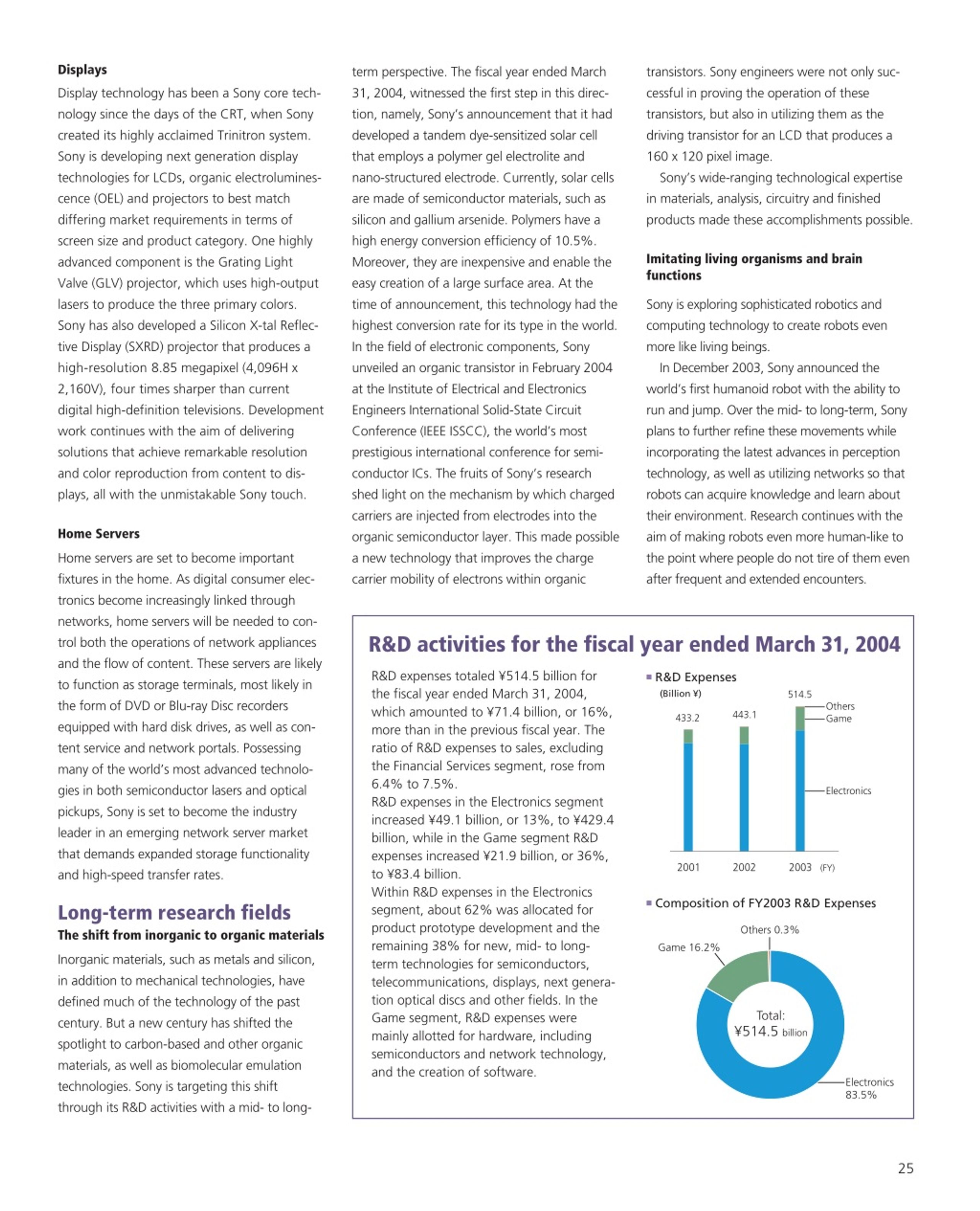 Displays term perspective. The fiscal year ended March 31, 2004, witnessed the first step in this direc- tion, namely, Sony’s announcement that it had developed a tandem dye-sensitized solar cell that employs a polymer gel electrolite and nano-structured electrode. Currently, solar cells are made of semiconductor materials, such as silicon and gallium arsenide. Polymers have a high energy conversion efficiency of 10.5%. Moreover, they are inexpensive and enable the easy creation of a large surface area. At the time of announcement, this technology had the highest conversion rate for its type in the world. In the field of electronic components, Sony unveiled an organic transistor in February 2004 at the Institute of Electrical and Electronics Engineers International Solid-State Circuit Conference (IEEE ISSCC), the world’s most prestigious international conference for semi- conductor ICs. The fruits of Sony’s research shed light on the mechanism by which charged carriers are injected from electrodes into the organic semiconductor layer. This made possible a new technology that improves the charge carrier mobility of electrons within organic transistors. Sony engineers were not only suc- cessful in proving the operation of these transistors, but also in utilizing them as the driving transistor for an LCD that produces a 160 x 120 pixel image. Sony’s wide-ranging technological expertise in materials, analysis, circuitry and finished products made these accomplishments possible. Display technology has been a Sony core tech- nology since the days of the CRT, when Sony created its highly acclaimed Trinitron system. Sony is developing next generation display technologies for LCDs, organic electrolumines- cence (OEL) and projectors to best match differing market requirements in terms of screen size and product category. One highly advanced component is the Grating Light Valve (GLV) projector, which uses high-output lasers to produce the three primary colors. Sony has also developed a Silicon X-tal Reflec- tive Display (SXRD) projector that produces a high-resolution 8.85 megapixel (4,096H x 2,160V), four times sharper than current digital high-definition televisions. Development work continues with the aim of delivering solutions that achieve remarkable resolution and color reproduction from content to dis- plays, all with the unmistakable Sony touch. Imitating living organisms and brain functions Sony is exploring sophisticated robotics and computing technology to create robots even more like living beings. In December 2003, Sony announced the world’s first humanoid robot with the ability to run and jump. Over the mid- to long-term, Sony plans to further refine these movements while incorporating the latest advances in perception technology, as well as utilizing networks so that robots can acquire knowledge and learn about their environment. Research continues with the aim of making robots even more human-like to the point where people do not tire of them even after frequent and extended encounters. Home Servers Home servers are set to become important fixtures in the home. As digital consumer elec- tronics become increasingly linked through networks, home servers will be needed to con- trol both the operations of network appliances and the flow of content. These servers are likely to function as storage terminals, most likely in the form of DVD or Blu-ray Disc recorders equipped with hard disk drives, as well as con- tent service and network portals. Possessing many of the world’s most advanced technolo- gies in both semiconductor lasers and optical pickups, Sony is set to become the industry leader in an emerging network server market that demands expanded storage functionality and high-speed transfer rates. R&D activities for the fiscal year ended March 31, 2004 R&D expenses totaled ¥514.5 billion for the fiscal year ended March 31, 2004, which amounted to ¥71.4 billion, or 16%, more than in the previous fiscal year. The ratio of R&D expenses to sales, excluding the Financial Services segment, rose from 6.4% to 7.5%. R&D expenses in the Electronics segment increased ¥49.1 billion, or 13%, to ¥429.4 billion, while in the Game segment R&D expenses increased ¥21.9 billion, or 36%, to ¥83.4 billion. Within R&D expenses in the Electronics segment, about 62% was allocated for product prototype development and the remaining 38% for new, mid- to long- term technologies for semiconductors, telecommunications, displays, next genera- tion optical discs and other fields. In the Game segment, R&D expenses were mainly allotted for hardware, including semiconductors and network technology, and the creation of software. ■ R&D Expenses (Billion ¥) 514.5 Others Game 443.1 433.2 Electronics 2001 2002 2003 (FY) ■ Composition of FY2003 R&D Expenses Long-term research fields The shift from inorganic to organic materials Others 0.3% Game 16.2% Inorganic materials, such as metals and silicon, in addition to mechanical technologies, have defined much of the technology of the past century. But a new century has shifted the spotlight to carbon-based and other organic materials, as well as biomolecular emulation technologies. Sony is targeting this shift through its R&D activities with a mid- to long- Total: ¥514.5 billion Electronics 83.5% 25