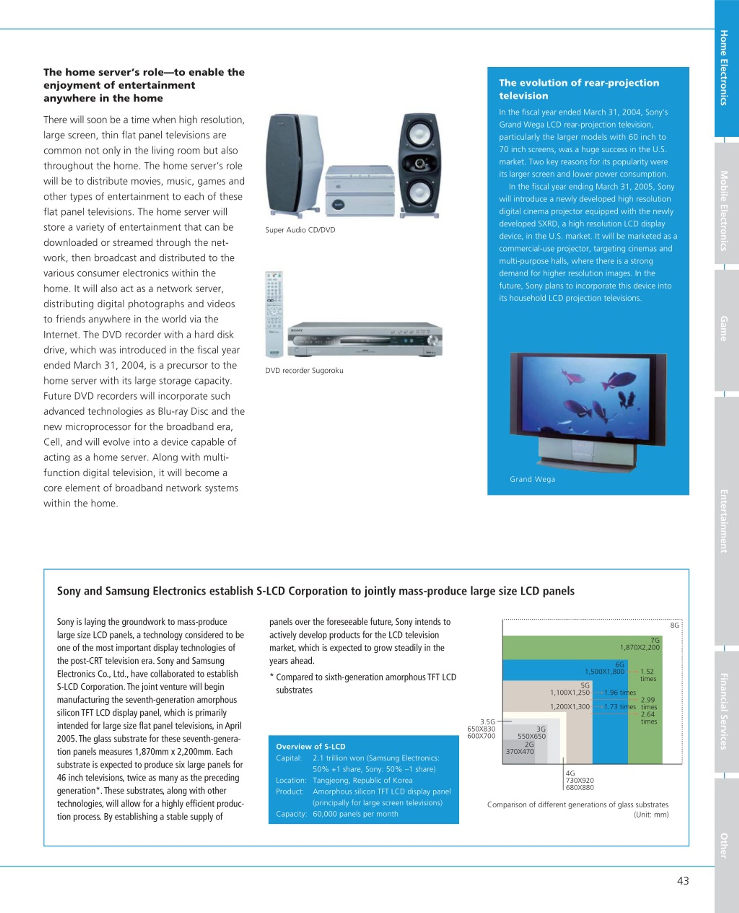 Home Electronics The home server’s role—to enable the enjoyment of entertainment anywhere in the home The evolution of rear-projection television In the fiscal year ended March 31, 2004, Sony’s Grand Wega LCD rear-projection television, particularly the larger models with 60 inch to 70 inch screens, was a huge success in the U.S. market. Two key reasons for its popularity were its larger screen and lower power consumption. In the fiscal year ending March 31, 2005, Sony will introduce a newly developed high resolution digital cinema projector equipped with the newly developed SXRD, a high resolution LCD display device, in the U.S. market. It will be marketed as a commercial-use projector, targeting cinemas and multi-purpose halls, where there is a strong demand for higher resolution images. In the future, Sony plans to incorporate this device into its household LCD projection televisions. There will soon be a time when high resolution, large screen, thin flat panel televisions are common not only in the living room but also throughout the home. The home server’s role will be to distribute movies, music, games and other types of entertainment to each of these flat panel televisions. The home server will store a variety of entertainment that can be downloaded or streamed through the net- work, then broadcast and distributed to the various consumer electronics within the home. It will also act as a network server, distributing digital photographs and videos to friends anywhere in the world via the Internet. The DVD recorder with a hard disk drive, which was introduced in the fiscal year ended March 31, 2004, is a precursor to the home server with its large storage capacity. Future DVD recorders will incorporate such advanced technologies as Blu-ray Disc and the new microprocessor for the broadband era, Cell, and will evolve into a device capable of acting as a home server. Along with multi- function digital television, it will become a core element of broadband network systems within the home. Mobile Electronics Super Audio CD/DVD Game DVD recorder Sugoroku Grand Wega Entertainment Sony and Samsung Electronics establish S-LCD Corporation to jointly mass-produce large size LCD panels Sony is laying the groundwork to mass-produce large size LCD panels, a technology considered to be one of the most important display technologies of the post-CRT television era. Sony and Samsung Electronics Co., Ltd., have collaborated to establish S-LCD Corporation. The joint venture will begin manufacturing the seventh-generation amorphous silicon TFT LCD display panel, which is primarily intended for large size flat panel televisions, in April 2005. The glass substrate for these seventh-genera- tion panels measures 1,870mm x 2,200mm. Each substrate is expected to produce six large panels for 46 inch televisions, twice as many as the preceding generation*. These substrates, along with other technologies, will allow for a highly efficient produc- tion process. By establishing a stable supply of panels over the foreseeable future, Sony intends to actively develop products for the LCD television market, which is expected to grow steadily in the years ahead. 8G 7G 1,870X2,200 6G 1,500X1,800 1.52 times * Compared to sixth-generation amorphous TFT LCD substrates Financial Services 5G 1,100X1,250 1.96 times 2.99 times 2.64 times 1,200X1,300 1.73 times 3.5G 650X830 600X700 3G 550X650 2G Overview of S-LCD Capital: 370X470 2.1 trillion won (Samsung Electronics: 50% +1 share, Sony: 50% –1 share) Location: Tangjeong, Republic of Korea Product: Amorphous silicon TFT LCD display panel (principally for large screen televisions) Capacity: 60,000 panels per month 4G 730X920 680X880 Comparison of different generations of glass substrates (Unit: mm) Other 43