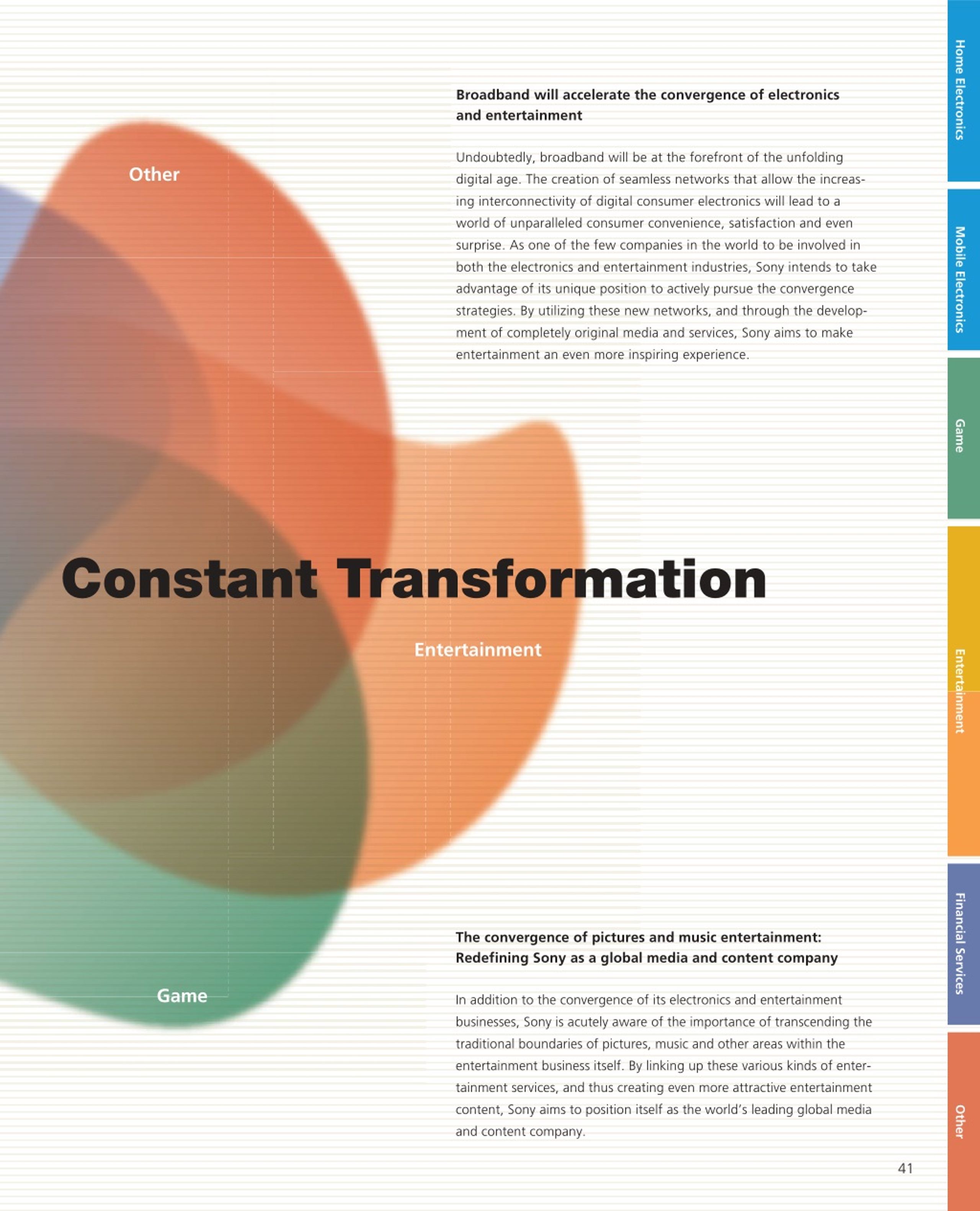 Home Electronics Broadband will accelerate the convergence of electronics and entertainment Undoubtedly, broadband will be at the forefront of the unfolding Other digital age. The creation of seamless networks that allow the increas- ing interconnectivity of digital consumer electronics will lead to a world of unparalleled consumer convenience, satisfaction and even Mobile Electronics surprise. As one of the few companies in the world to be involved in both the electronics and entertainment industries, Sony intends to take advantage of its unique position to actively pursue the convergence strategies. By utilizing these new networks, and through the develop- ment of completely original media and services, Sony aims to make entertainment an even more inspiring experience. Game Constant Transformation Entertainment Entertainment Financial Services The convergence of pictures and music entertainment: Redefining Sony as a global media and content company Game In addition to the convergence of its electronics and entertainment businesses, Sony is acutely aware of the importance of transcending the traditional boundaries of pictures, music and other areas within the entertainment business itself. By linking up these various kinds of enter- tainment services, and thus creating even more attractive entertainment content, Sony aims to position itself as the world’s leading global media Other and content company. 41