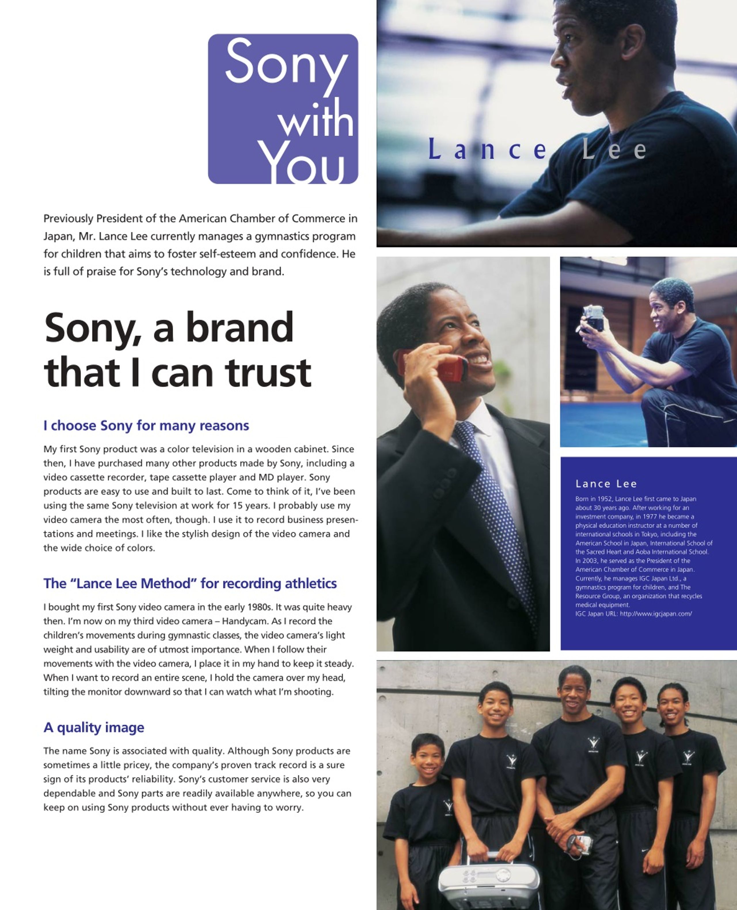 L a n c e L e e Previously President of the American Chamber of Commerce in Japan, Mr. Lance Lee currently manages a gymnastics program for children that aims to foster self-esteem and confidence. He is full of praise for Sony’s technology and brand. Sony, a brand that I can trust I choose Sony for many reasons My first Sony product was a color television in a wooden cabinet. Since then, I have purchased many other products made by Sony, including a video cassette recorder, tape cassette player and MD player. Sony products are easy to use and built to last. Come to think of it, I’ve been using the same Sony television at work for 15 years. I probably use my video camera the most often, though. I use it to record business presen- tations and meetings. I like the stylish design of the video camera and the wide choice of colors. Lance Lee Born in 1952, Lance Lee first came to Japan about 30 years ago. After working for an investment company, in 1977 he became a physical education instructor at a number of international schools in Tokyo, including the American School in Japan, International School of the Sacred Heart and Aoba International School. In 2003, he served as the President of the American Chamber of Commerce in Japan. Currently, he manages IGC Japan Ltd., a gymnastics program for children, and The Resource Group, an organization that recycles medical equipment. IGC Japan URL: http://www.igcjapan.com/ The “Lance Lee Method” for recording athletics I bought my first Sony video camera in the early 1980s. It was quite heavy then. I’m now on my third video camera – Handycam. As I record the children’s movements during gymnastic classes, the video camera’s light weight and usability are of utmost importance. When I follow their movements with the video camera, I place it in my hand to keep it steady. When I want to record an entire scene, I hold the camera over my head, tilting the monitor downward so that I can watch what I’m shooting. A quality image The name Sony is associated with quality. Although Sony products are sometimes a little pricey, the company’s proven track record is a sure sign of its products’ reliability. Sony’s customer service is also very dependable and Sony parts are readily available anywhere, so you can keep on using Sony products without ever having to worry. 35