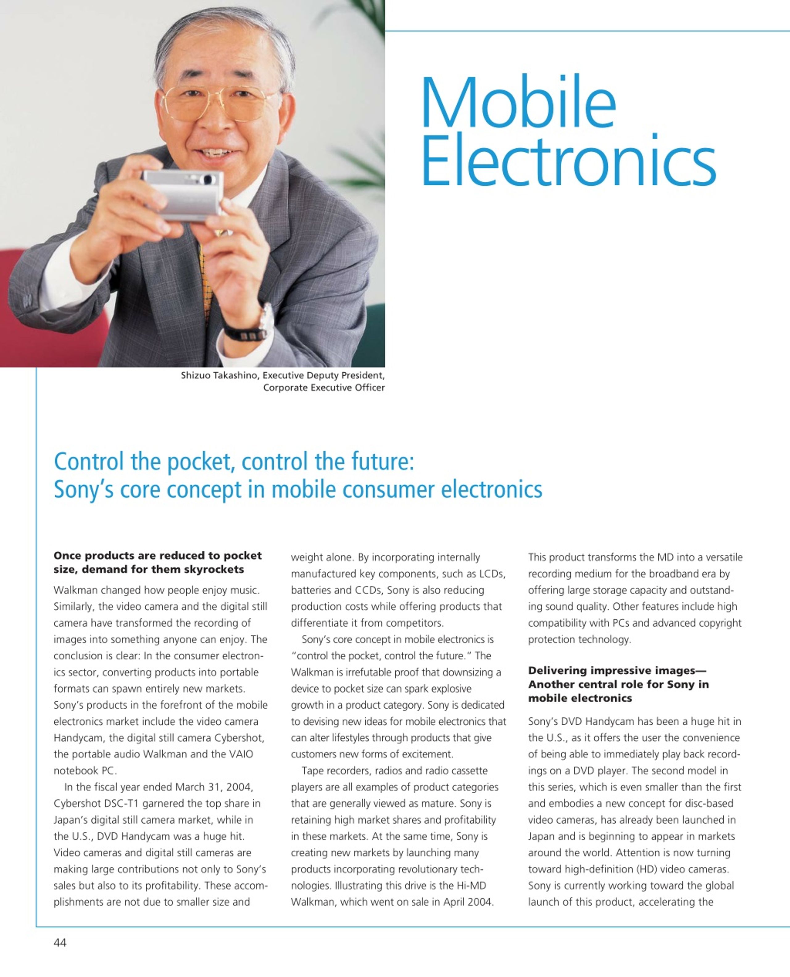 Mobile Electronics Shizuo Takashino, Executive Deputy President, Corporate Executive Officer Control the pocket, control the future: Sony’s core concept in mobile consumer electronics Once products are reduced to pocket size, demand for them skyrockets weight alone. By incorporating internally manufactured key components, such as LCDs, batteries and CCDs, Sony is also reducing production costs while offering products that differentiate it from competitors. Sony’s core concept in mobile electronics is “control the pocket, control the future.” The Walkman is irrefutable proof that downsizing a device to pocket size can spark explosive growth in a product category. Sony is dedicated to devising new ideas for mobile electronics that can alter lifestyles through products that give customers new forms of excitement. Tape recorders, radios and radio cassette players are all examples of product categories that are generally viewed as mature. Sony is retaining high market shares and profitability in these markets. At the same time, Sony is creating new markets by launching many products incorporating revolutionary tech- nologies. Illustrating this drive is the Hi-MD Walkman, which went on sale in April 2004. This product transforms the MD into a versatile recording medium for the broadband era by offering large storage capacity and outstand- ing sound quality. Other features include high compatibility with PCs and advanced copyright protection technology. Walkman changed how people enjoy music. Similarly, the video camera and the digital still camera have transformed the recording of images into something anyone can enjoy. The conclusion is clear: In the consumer electron- ics sector, converting products into portable formats can spawn entirely new markets. Sony’s products in the forefront of the mobile electronics market include the video camera Handycam, the digital still camera Cybershot, the portable audio Walkman and the VAIO notebook PC. In the fiscal year ended March 31, 2004, Cybershot DSC-T1 garnered the top share in Japan’s digital still camera market, while in the U.S., DVD Handycam was a huge hit. Video cameras and digital still cameras are making large contributions not only to Sony’s sales but also to its profitability. These accom- plishments are not due to smaller size and Delivering impressive images— Another central role for Sony in mobile electronics Sony’s DVD Handycam has been a huge hit in the U.S., as it offers the user the convenience of being able to immediately play back record- ings on a DVD player. The second model in this series, which is even smaller than the first and embodies a new concept for disc-based video cameras, has already been launched in Japan and is beginning to appear in markets around the world. Attention is now turning toward high-definition (HD) video cameras. Sony is currently working toward the global launch of this product, accelerating the 44