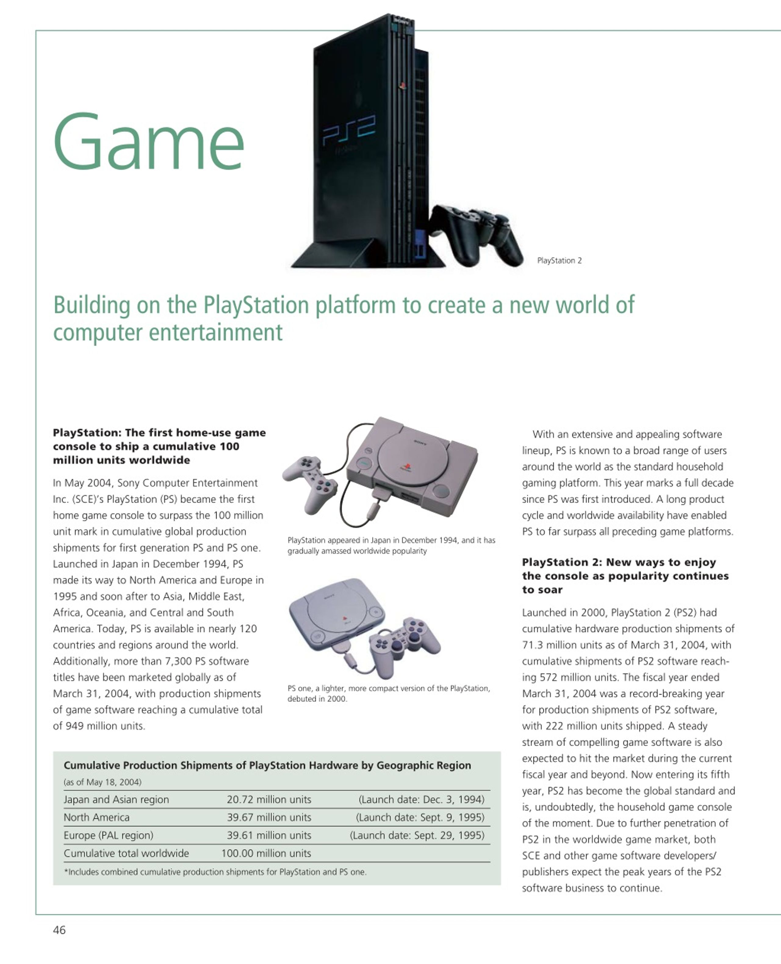 Game PlayStation 2 Building on the PlayStation platform to create a new world of computer entertainment PlayStation: The first home-use game console to ship a cumulative 100 million units worldwide With an extensive and appealing software lineup, PS is known to a broad range of users around the world as the standard household gaming platform. This year marks a full decade since PS was first introduced. A long product cycle and worldwide availability have enabled PS to far surpass all preceding game platforms. In May 2004, Sony Computer Entertainment Inc. (SCE)’s PlayStation (PS) became the first home game console to surpass the 100 million unit mark in cumulative global production shipments for first generation PS and PS one. Launched in Japan in December 1994, PS made its way to North America and Europe in 1995 and soon after to Asia, Middle East, Africa, Oceania, and Central and South America. Today, PS is available in nearly 120 countries and regions around the world. Additionally, more than 7,300 PS software titles have been marketed globally as of March 31, 2004, with production shipments of game software reaching a cumulative total of 949 million units. PlayStation appeared in Japan in December 1994, and it has gradually amassed worldwide popularity PlayStation 2: New ways to enjoy the console as popularity continues to soar Launched in 2000, PlayStation 2 (PS2) had cumulative hardware production shipments of 71.3 million units as of March 31, 2004, with cumulative shipments of PS2 software reach- ing 572 million units. The fiscal year ended March 31, 2004 was a record-breaking year for production shipments of PS2 software, with 222 million units shipped. A steady stream of compelling game software is also expected to hit the market during the current fiscal year and beyond. Now entering its fifth year, PS2 has become the global standard and is, undoubtedly, the household game console of the moment. Due to further penetration of PS2 in the worldwide game market, both SCE and other game software developers/ publishers expect the peak years of the PS2 software business to continue. PS one, a lighter, more compact version of the PlayStation, debuted in 2000. Cumulative Production Shipments of PlayStation Hardware by Geographic Region (as of May 18, 2004) Japan and Asian region 20.72 million units (Launch date: Dec. 3, 1994) North America 39.67 million units (Launch date: Sept. 9, 1995) Europe (PAL region) 39.61 million units (Launch date: Sept. 29, 1995) Cumulative total worldwide 100.00 million units *Includes combined cumulative production shipments for PlayStation and PS one. 46