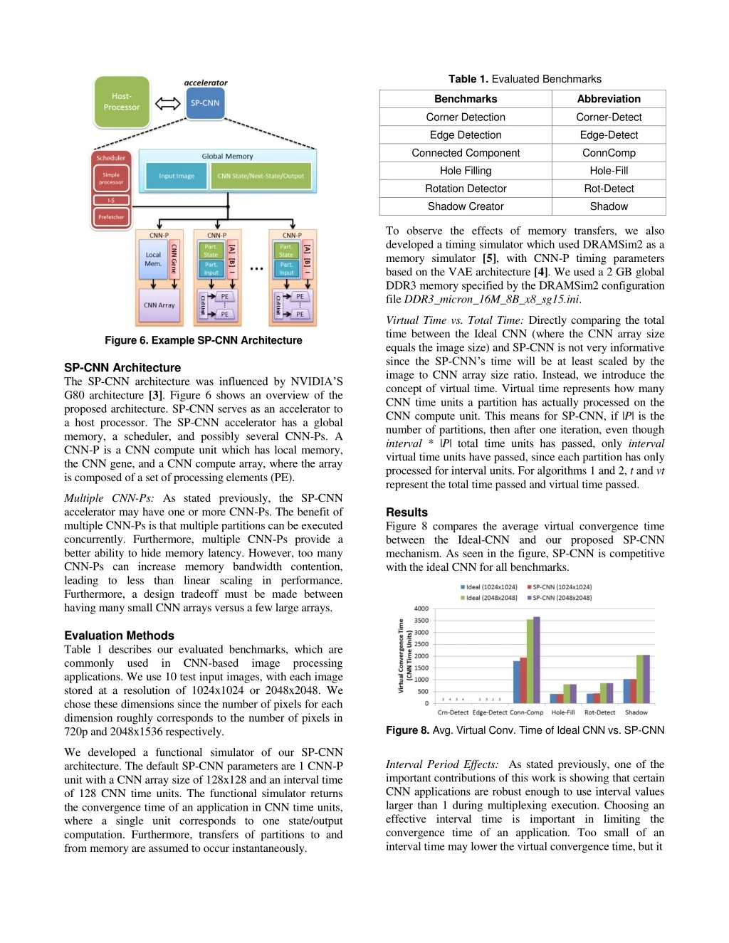 Table 1. Evaluated Benchmarks Benchmarks Abbreviation Corner Detection Edge Detection Connected Component Hole Filling Rotation Detector Shadow Creator Corner-Detect Edge-Detect ConnComp Hole-Fill Rot-Detect Shadow To observe the effects of memory transfers, we also developed a timing simulator which used DRAMSim2 as a memory simulator [5], with CNN-P timing parameters based on the VAE architecture [4]. We used a 2 GB global DDR3 memory specified by the DRAMSim2 configuration file DDR3_micron_16M_8B_x8_sg15.ini. Virtual Time vs. Total Time: Directly comparing the total time between the Ideal CNN (where the CNN array size equals the image size) and SP-CNN is not very informative since the SP-CNN’s time will be at least scaled by the image to CNN array size ratio. Instead, we introduce the concept of virtual time. Virtual time represents how many CNN time units a partition has actually processed on the CNN compute unit. This means for SP-CNN, if |P| is the number of partitions, then after one iteration, even though interval * |P| total time units has passed, only interval virtual time units have passed, since each partition has only processed for interval units. For algorithms 1 and 2, t and vt represent the total time passed and virtual time passed. Figure 6. Example SP-CNN Architecture SP-CNN Architecture The SP-CNN architecture was influenced by NVIDIA’S G80 architecture [3]. Figure 6 shows an overview of the proposed architecture. SP-CNN serves as an accelerator to a host processor. The SP-CNN accelerator has a global memory, a scheduler, and possibly several CNN-Ps. A CNN-P is a CNN compute unit which has local memory, the CNN gene, and a CNN compute array, where the array is composed of a set of processing elements (PE). Multiple CNN-Ps: As stated previously, the SP-CNN accelerator may have one or more CNN-Ps. The benefit of multiple CNN-Ps is that multiple partitions can be executed concurrently. Furthermore, multiple CNN-Ps provide a better ability to hide memory latency. However, too many CNN-Ps can increase memory bandwidth contention, leading to less than linear scaling in performance. Furthermore, a design tradeoff must be made between having many small CNN arrays versus a few large arrays. Results Figure 8 compares the average virtual convergence time between the Ideal-CNN and our proposed SP-CNN mechanism. As seen in the figure, SP-CNN is competitive with the ideal CNN for all benchmarks. Evaluation Methods Table 1 describes our evaluated benchmarks, which are commonly used in CNN-based image processing applications. We use 10 test input images, with each image stored at a resolution of 1024x1024 or 2048x2048. We chose these dimensions since the number of pixels for each dimension roughly corresponds to the number of pixels in 720p and 2048x1536 respectively. Figure 8. Avg. Virtual Conv. Time of Ideal CNN vs. SP-CNN We developed a functional simulator of our SP-CNN architecture. The default SP-CNN parameters are 1 CNN-P unit with a CNN array size of 128x128 and an interval time of 128 CNN time units. The functional simulator returns the convergence time of an application in CNN time units, where a single unit corresponds to one state/output computation. Furthermore, transfers of partitions to and from memory are assumed to occur instantaneously. Interval Period Effects: As stated previously, one of the important contributions of this work is showing that certain CNN applications are robust enough to use interval values larger than 1 during multiplexing execution. Choosing an effective interval time is important in limiting the convergence time of an application. Too small of an interval time may lower the virtual convergence time, but it