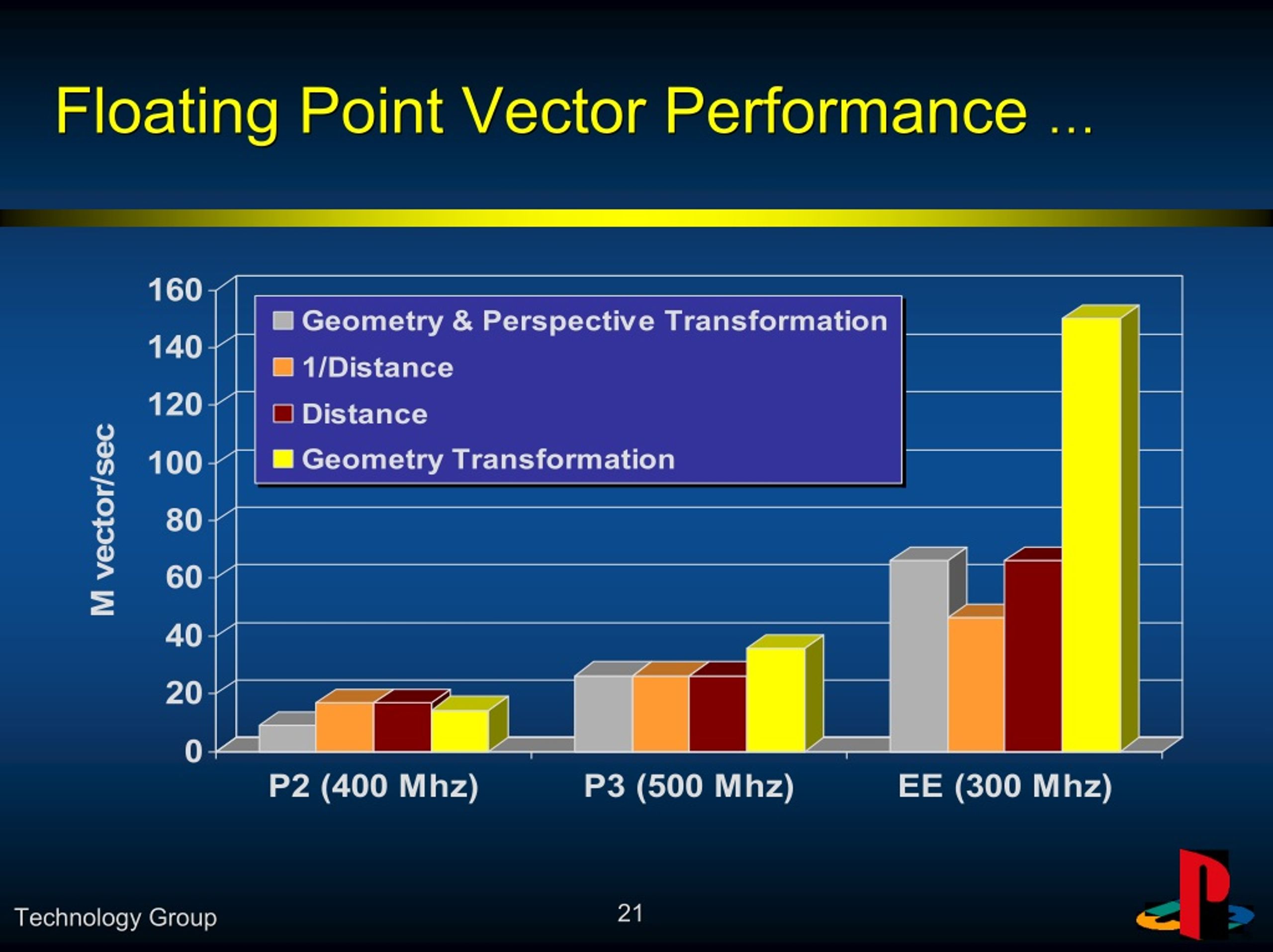 Floating Point Vector Performance … Floating Point Vector Performance … 160 Geometry & Perspective Transformation 140 1/Distance 120 Distance Geometry Transformation M vector/sec 100 80 60 40 20 0 P2 (400 Mhz) P3 (500 Mhz) EE (300 Mhz) 21 21 Technology Group Technology Group