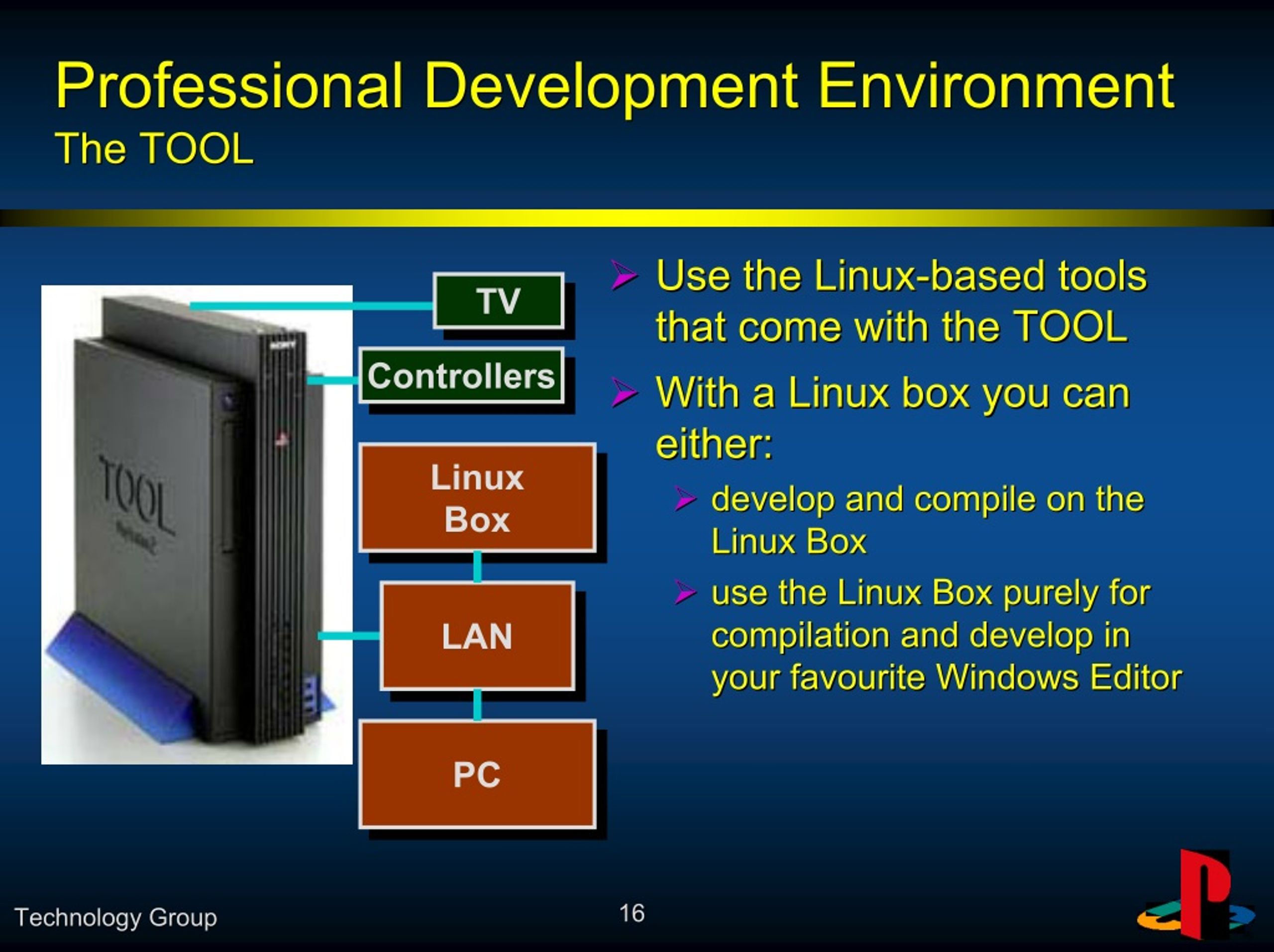 Developing at home – PS2 Linux Developing at home – PS2 Linux ? ? PlayStation 2 branded USB keyboard & mouse PlayStation 2 branded USB keyboard & mouse ? ? 10/100 Ethernet Adapter 10/100 Ethernet Adapter ? ? 40GB Hard Disk 40GB Hard Disk ? ? Monitor cable Monitor cable ? ? 2 x install DVD’s 2 x install DVD’s ? ? Linux Linux ? ? Hardware Manuals Hardware Manuals ? ? Tools, Examples Tools, Examples ? ? Simple EULA Simple EULA ? ? Launched: 22 May ’02 Launched: 22 May ’02 ? ? € € 249 (excl. VAT and Shipping) from 249 (excl. VAT and Shipping) from http://www.linuxplay.com/ http://www.linuxplay.com/ 17 17 Technology Group Technology Group