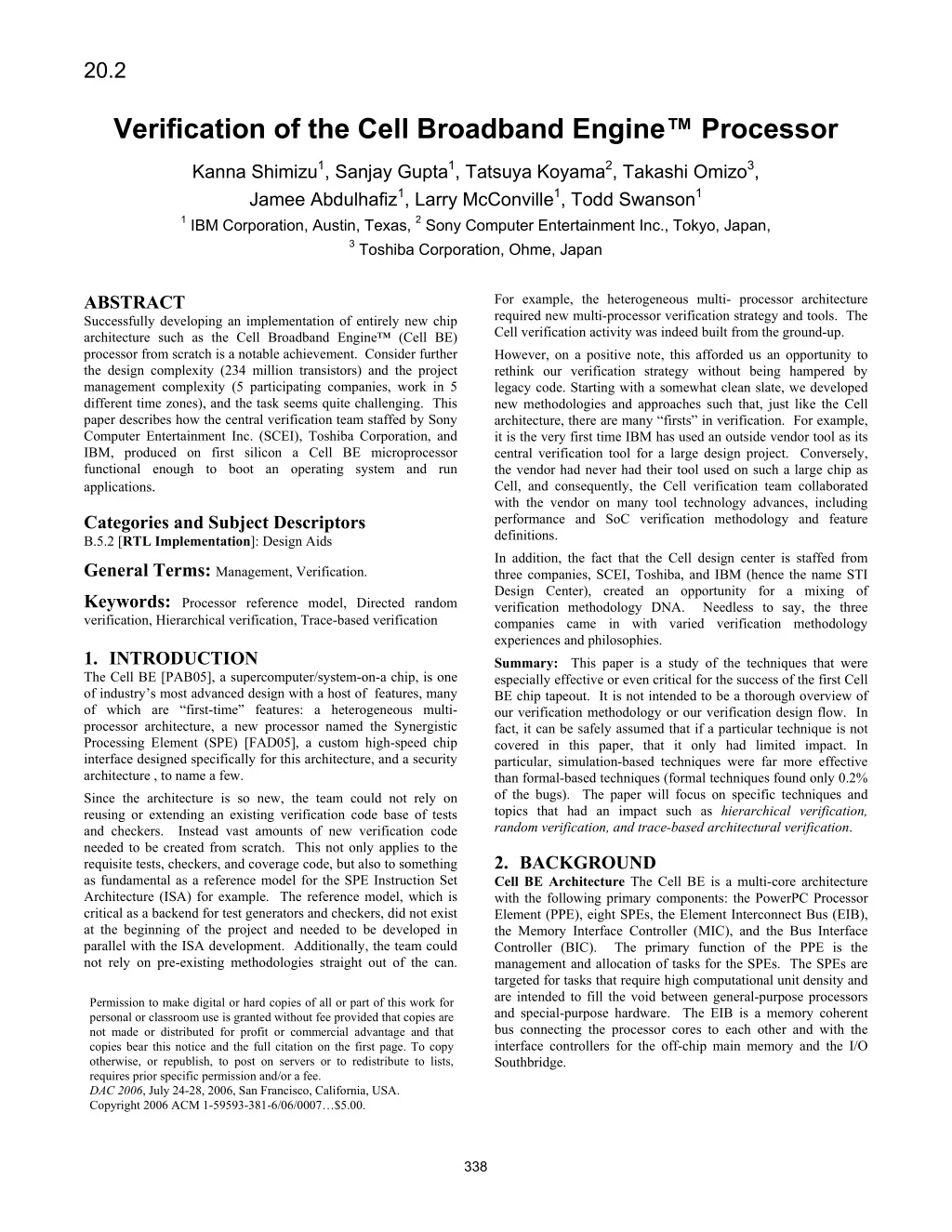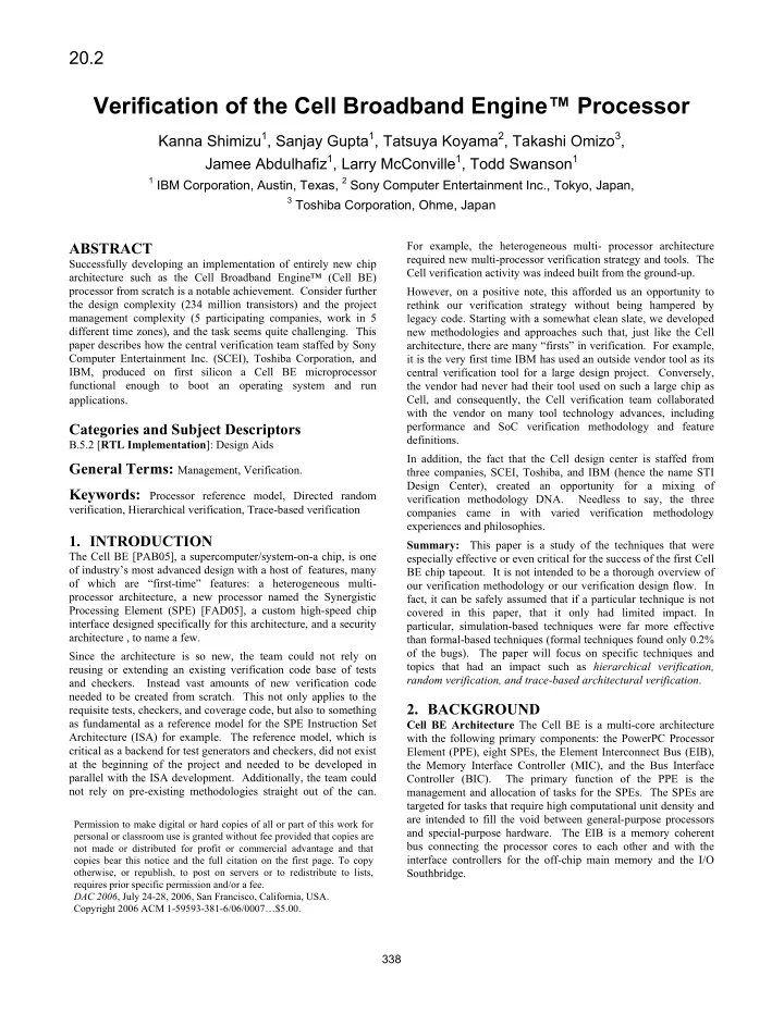 20.2 Verification of the Cell Broadband Engine™ Processor Kanna Shimizu1, Sanjay Gupta1, Tatsuya Koyama2, Takashi Omizo3, Jamee Abdulhafiz1, Larry McConville1, Todd Swanson1 1 IBM Corporation, Austin, Texas, 2 Sony Computer Entertainment Inc., Tokyo, Japan, 3 Toshiba Corporation, Ohme, Japan ABSTRACT Successfully developing an implementation of entirely new chip architecture such as the Cell Broadband Engine™ (Cell BE) processor from scratch is a notable achievement. Consider further the design complexity (234 million transistors) and the project management complexity (5 participating companies, work in 5 different time zones), and the task seems quite challenging. This paper describes how the central verification team staffed by Sony Computer Entertainment Inc. (SCEI), Toshiba Corporation, and IBM, produced on first silicon a Cell BE microprocessor functional enough to boot an operating system and run applications. For example, the heterogeneous multi- processor architecture required new multi-processor verification strategy and tools. The Cell verification activity was indeed built from the ground-up. However, on a positive note, this afforded us an opportunity to rethink our verification strategy without being hampered by legacy code. Starting with a somewhat clean slate, we developed new methodologies and approaches such that, just like the Cell architecture, there are many “firsts” in verification. For example, it is the very first time IBM has used an outside vendor tool as its central verification tool for a large design project. Conversely, the vendor had never had their tool used on such a large chip as Cell, and consequently, the Cell verification team collaborated with the vendor on many tool technology advances, including performance and SoC verification methodology and feature definitions. Categories and Subject Descriptors B.5.2 [RTL Implementation]: Design Aids In addition, the fact that the Cell design center is staffed from three companies, SCEI, Toshiba, and IBM (hence the name STI Design Center), created an opportunity for a mixing of verification methodology DNA. Needless to say, the three companies came in with varied verification methodology experiences and philosophies. General Terms: Management, Verification. Keywords: Processor reference model, Directed random verification, Hierarchical verification, Trace-based verification 1.INTRODUCTION The Cell BE [PAB05], a supercomputer/system-on-a chip, is one of industry’s most advanced design with a host of features, many of which are “first-time” features: a heterogeneous multi- processor architecture, a new processor named the Synergistic Processing Element (SPE) [FAD05], a custom high-speed chip interface designed specifically for this architecture, and a security architecture , to name a few. Summary: This paper is a study of the techniques that were especially effective or even critical for the success of the first Cell BE chip tapeout. It is not intended to be a thorough overview of our verification methodology or our verification design flow. In fact, it can be safely assumed that if a particular technique is not covered in this paper, that it only had limited impact. In particular, simulation-based techniques were far more effective than formal-based techniques (formal techniques found only 0.2% of the bugs). The paper will focus on specific techniques and topics that had an impact such as hierarchical verification, random verification, and trace-based architectural verification. Since the architecture is so new, the team could not rely on reusing or extending an existing verification code base of tests and checkers. Instead vast amounts of new verification code needed to be created from scratch. This not only applies to the requisite tests, checkers, and coverage code, but also to something as fundamental as a reference model for the SPE Instruction Set Architecture (ISA) for example. The reference model, which is critical as a backend for test generators and checkers, did not exist at the beginning of the project and needed to be developed in parallel with the ISA development. Additionally, the team could not rely on pre-existing methodologies straight out of the can. 2.BACKGROUND Cell BE Architecture The Cell BE is a multi-core architecture with the following primary components: the PowerPC Processor Element (PPE), eight SPEs, the Element Interconnect Bus (EIB), the Memory Interface Controller (MIC), and the Bus Interface Controller (BIC). The primary function of the PPE is the management and allocation of tasks for the SPEs. The SPEs are targeted for tasks that require high computational unit density and are intended to fill the void between general-purpose processors and special-purpose hardware. The EIB is a memory coherent bus connecting the processor cores to each other and with the interface controllers for the off-chip main memory and the I/O Southbridge. Permission to make digital or hard copies of all or part of this work for personal or classroom use is granted without fee provided that copies are not made or distributed for profit or commercial advantage and that copies bear this notice and the full citation on the first page. To copy otherwise, or republish, to post on servers or to redistribute to lists, requires prior specific permission and/or a fee. DAC 2006, July 24-28, 2006, San Francisco, California, USA. Copyright 2006 ACM 1-59593-381-6/06/0007…$5.00. 338