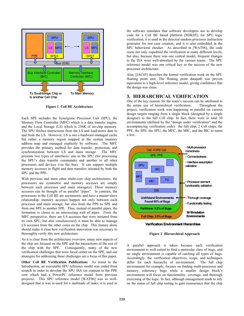 designed logic allowed the accesses in the list to be reshuffled and thereby not maintaining the PowerPC ordering rule. This bug was found by applying a pre-existing set of PowerPC CML checkers to the new architecture. 7.ACKNOWLEDGEMENTS The authors would like to thanks these people who gave it their all for this chip’s success: Salim Ahmed, Bill Tiernan, Gilles Gervais, Kenichi Takagi, Steve Roberts, Chris Spandikow, Hidenori Matsuzaki, Anush Rangarajan, Yukio Watanabe, Masaaki Nozaki, Jim Mikos, Hideyuki Saito, Lyle Grosbach, Richard Anderson, Andy Petruski, John Troppy, and many others. Because of its global nature, CML checkers are effective in finding bugs that are not caught by the unit checkers both in the unit environments and also in the chip environment. As an example, consider this bug that involved data flow through several units. For a particular type of DMA command, data is transferred from one unit to another and eventually to the LS. Although the full 128 byte full cache line is expected to be transferred to the LS, only 16 bytes was being transferred. The localized checks at the units and at the interfaces did not catch this bug. In contrast, a CML checker, which abstracts away details such as the multi-ported access to the LS memory to focus purely on the architecture, caught the incomplete transfer. To be precise, the bug was detected when a subsequent read result of the data at this address in simulation did not match the data in CML’s memory model of the LS. With its clean focus on global architecture, CML checkers are able to catch bugs that can be easily overlooked by localized and discrete unit checkers. CML was an indispensable tool in ensuring that the new Cell BE Architecture was indeed realized. 8.REFERENCES [PAB05] D. Pham et al. The Design and Implementation of a First-Generation CELL Processor. In IEEE International Solid- State Circuits Symposium, February 2005. [FAD05] B. Flachs et al. The Microarchitecture of the Streaming Processor for a CELL Processor. In IEEE International Solid- State Circuits Symposium, February 2005. [WAT06] Y. Watanabe et al. An SPU Reference Model for Simulation, Random Test Generation, and Verification. In IEEE Asia and South Pacific Design Automation Conference, January 2006. [SDK05] www-128.ibm.com/developerworks/power/cell/ [JAC05] C. Jacobi et al. Automatic Formal Verification of Fused- Multiply-Add FPUs. In IEEE Design Automation and Test in Europe Conference, March 2005. 6.CONCLUSION Overall Result The Cell design was simulated for over 2 trillion cycles before the chip was taped out for the first time. This sounds like a lot, but it translates to just 156 seconds of hardware operation time using the product clock frequency of 3.2 GHz. Therefore, it was especially critical to optimize the use of the simulation cycles to root out all the bugs including the corner case problems. After executing 780 million simulation tests, many of the bugs were detected. When the first Cell chip hardware came back, it immediately booted an operating system and ran applications. There were very few bugs that escaped verification into the first pass hardware. Analysis of these bug escapes showed that they required long and directed sequences of transactions with a very low probability of occurring in simulation; they are essentially bugs meant to be found in lab testing. One example is a data corruption error involving an abnormally long latency for the bus grant. In fact, even with lab testing, it was only exposed in a dual Cell system where latencies are longer. As this bug was not even seen in lab tests on a single Cell system, it is unlikely that it would have been found in any random simulation test no matter how long the simulation ran. [EME02] R. Emek et al. X-Gen: A Random Test-Case Generator for Systems and SoCs. In IEEE International High Level Design Validation and Test Workshop, 2002. [CML02] Ludden et al. Functional Verification of the POWER4 microprocessor and POWER4 multiprocessor system. In IBM Journal of Research and Development, Volume 46, Number 1, 2002. [SS05] Gott et al. Functional Formal Verification on designs of pSeries microprocessors and communication subsystems In IBM Jounal of Research and Development, Volume 49, Number 4,5, 2005. [RB05] RuleBase: Model Checking at IBM. In Computer Aided Verification (CAV), 1997. [GPRO95] Aharon et al. Test Program Generation for Functional Verification of PowerPC Processors in IBM. In Design Automation Conference (DAC), 1995. 343