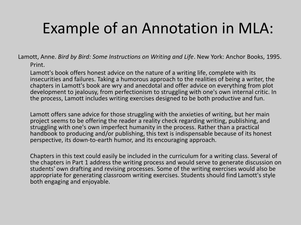 Example of an Annotation in MLA: Lamott, Anne. Bird by Bird: Some Instructions on Writing and Life. New York: Anchor Books, 1995. Print. Lamott's book offers honest advice on the nature of a writing life, complete with its insecurities and failures. Taking a humorous approach to the realities of being a writer, the chapters in Lamott's book are wry and anecdotal and offer advice on everything from plot development to jealousy, from perfectionism to struggling with one's own internal critic. In the process, Lamott includes writing exercises designed to be both productive and fun. Lamott offers sane advice for those struggling with the anxieties of writing, but her main project seems to be offering the reader a reality check regarding writing, publishing, and struggling with one's own imperfect humanity in the process. Rather than a practical handbook to producing and/or publishing, this text is indispensable because of its honest perspective, its down-to-earth humor, and its encouraging approach. Chapters in this text could easily be included in the curriculum for a writing class. Several of the chapters in Part 1 address the writing process and would serve to generate discussion on students' own drafting and revising processes. Some of the writing exercises would also be appropriate for generating classroom writing exercises. Students should find Lamott's style both engaging and enjoyable.