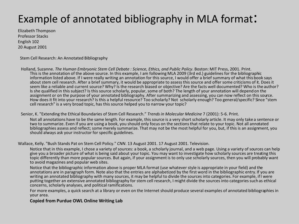 Example of annotated bibliography in MLA format: Elizabeth Thompson Professor Stacks English 102 20 August 2001 Stem Cell Research: An Annotated Bibliography Holland, Suzanne. The Human Embryonic Stem Cell Debate : Science, Ethics, and Public Policy. Boston: MIT Press, 2001. Print. This is the annotation of the above source. In this example, I am following MLA 2009 (3rd ed.) guidelines for the bibliographic information listed above. If I were really writing an annotation for this source, I would offer a brief summary of what this book says about stem cell research. After a brief summary, it would be appropriate to assess this source and offer some criticisms of it. Does it seem like a reliable and current source? Why? Is the research biased or objective? Are the facts well documented? Who is the author? Is she qualified in this subject? Is this source scholarly, popular, some of both? The length of your annotation will depend on the assignment or on the purpose of your annotated bibliography. After summarizing and assessing, you can now reflect on this source. How does it fit into your research? Is this a helpful resource? Too scholarly? Not scholarly enough? Too general/specific? Since "stem cell research" is a very broad topic, has this source helped you to narrow your topic? Senior, K. "Extending the Ethical Boundaries of Stem Cell Research.” Trends in Molecular Medicine 7 (2001): 5-6. Print. Not all annotations have to be the same length. For example, this source is a very short scholarly article. It may only take a sentence or two to summarize. Even if you are using a book, you should only focus on the sections that relate to your topic. Not all annotated bibliographies assess and reflect; some merely summarize. That may not be the most helpful for you, but, if this is an assignment, you should always ask your instructor for specific guidelines. Wallace, Kelly. "Bush Stands Pat on Stem Cell Policy." CNN. 13 August 2001. 17 August 2001. Television. Notice that in this example, I chose a variety of sources: a book, a scholarly journal, and a web page. Using a variety of sources can help give you a broader picture of what is being said about your topic. You may want to investigate how scholarly sources are treating this topic differently than more popular sources. But again, if your assignment is to only use scholarly sources, then you will probably want to avoid magazines and popular web sites. Notice that the bibliographic information above is proper MLA format (use whatever style is appropriate in your field) and the annotations are in paragraph form. Note also that the entries are alphabetized by the first word in the bibliographic entry. If you are writing an annotated bibliography with many sources, it may be helpful to divide the sources into categories. For example, if I were putting together an extensive annotated bibliography for stem cell research, I might divide the sources into categories such as ethical concerns, scholarly analyses, and political ramifications. For more examples, a quick search at a library or even on the Internet should produce several examples of annotated bibliographies in your area. Copied from Purdue OWL Online Writing Lab