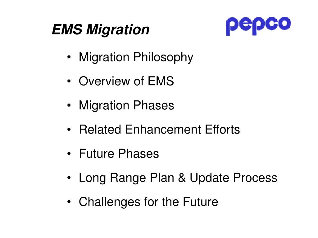 Understand PEPCO's EMS migration philosophy that ensures system modernization, enhancement, and future scalability to support changing business requirements. Gain insights into the migration phases, challenges faced, and the long-range plan for EMS system updates.