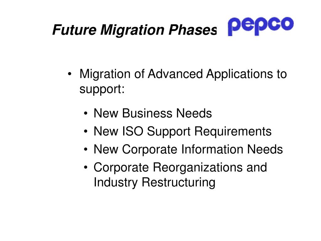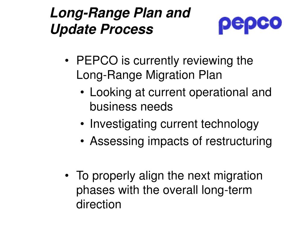 Long-Range Plan and Update Process • PEPCO is currently reviewing the Long-Range Migration Plan • Looking at current operational and business needs • Investigating current technology • Assessing impacts of restructuring • To properly align the next migration phases with the overall long-term direction