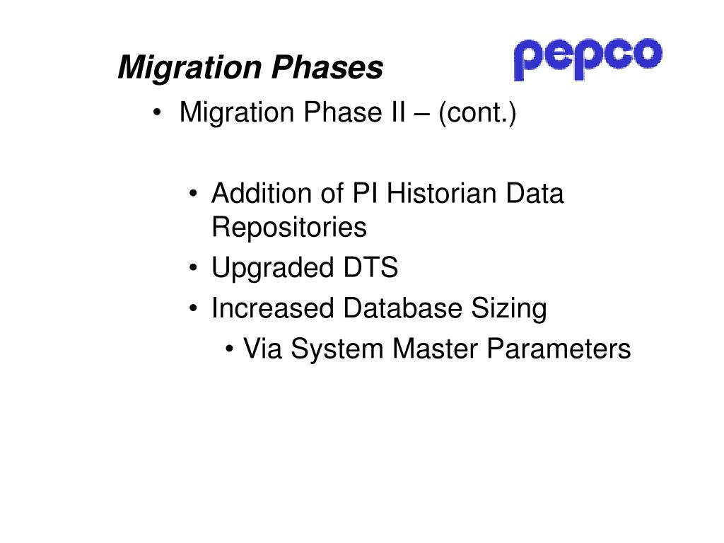 Migration Phases • Migration Phase II – (cont.) • Addition of PI Historian Data Repositories • Upgraded DTS • Increased Database Sizing • Via System Master Parameters