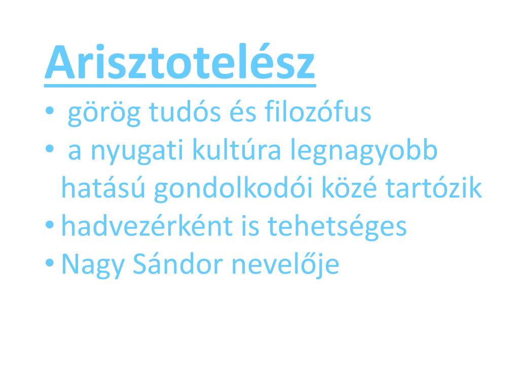 Arisztotelész • görög tudós és filozófus • a nyugati kultúra legnagyobb hatású gondolkodói közé tartózik • hadvezérként is tehetséges • Nagy Sándor nevelője