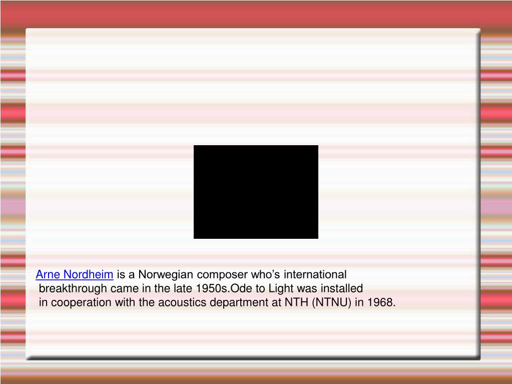 Arne Nordheim is a Norwegian composer who’s international breakthrough came in the late 1950s.Ode to Light was installed in cooperation with the acoustics department at NTH (NTNU) in 1968.