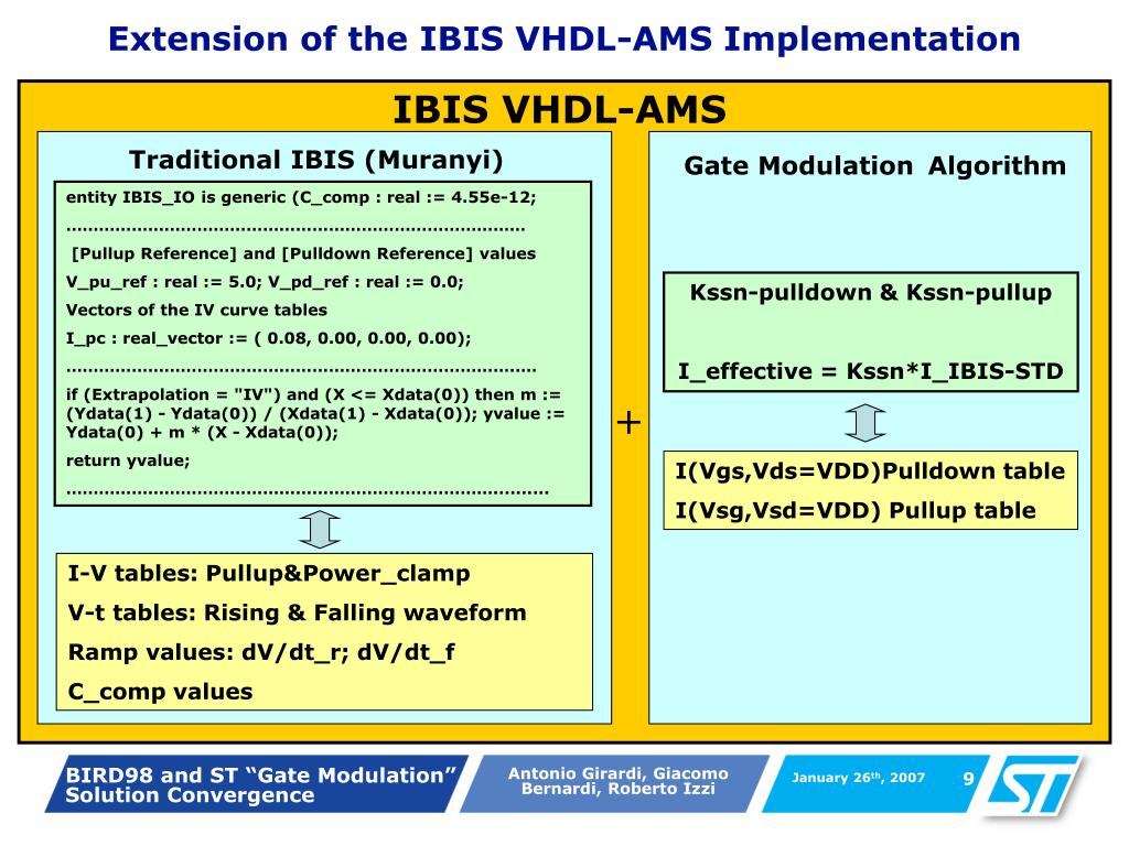 Agenda • IBIS “Gate Modulation” solution: ST Proposal overview • Implementation and Validation by the VHDL-AMS IBIS architecture • Potential implementation of the ST’s proposal inside a transistor-level EDA tool • BIRD98 & ST proposal convergence • Conclusions