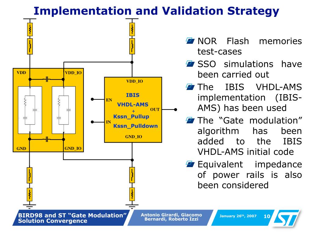 VDD VDD_IO VDD_IO IBIS VHDL-AMS EN OUT + Kssn_Pullup Kssn_Pulldown IN GND_IO GND_IO GND Implementation and Validation Strategy • NOR Flash memories test-cases • SSO simulations have been carried out • The IBIS VHDL-AMS implementation (IBIS-AMS) has been used • The “Gate modulation” algorithm has been added to the IBIS VHDL-AMS initial code • Equivalent impedance of power rails is also been considered