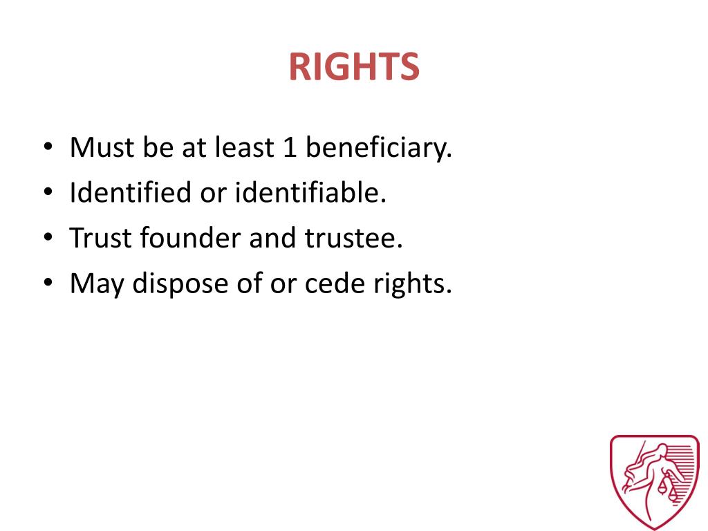 RIGHTS • Must be at least 1 beneficiary. • Identified or identifiable. • Trust founder and trustee. • May dispose of or cede rights.