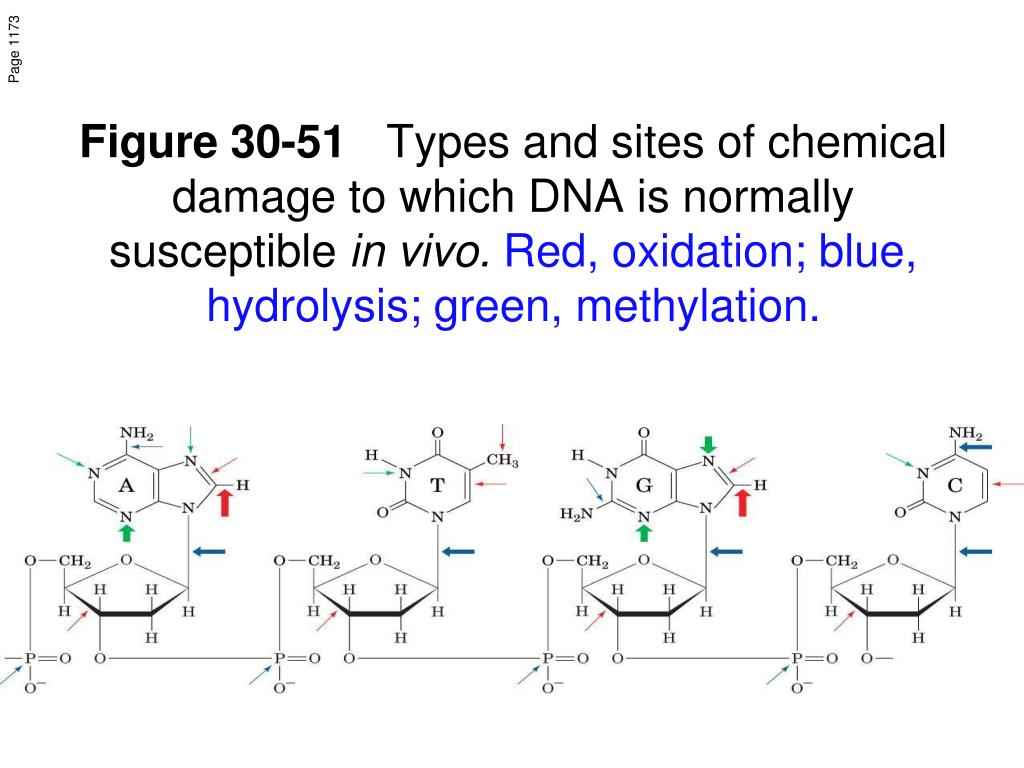 Page 1173 Figure 30-51 Types and sites of chemical damage to which DNA is normally susceptible in vivo. Red, oxidation; blue, hydrolysis; green, methylation.