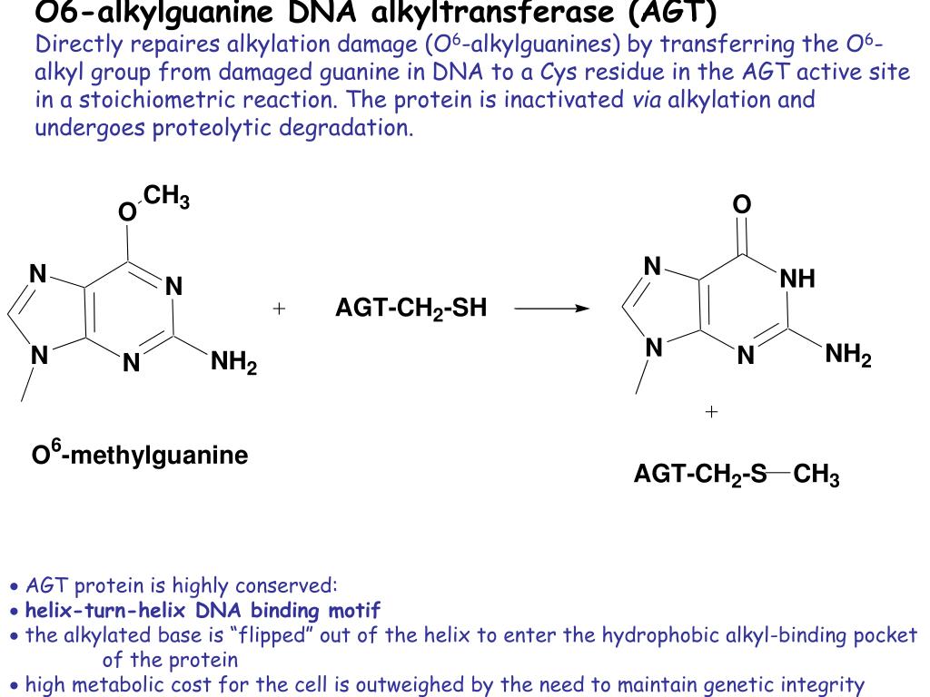 O6-alkylguanine DNA alkyltransferase (AGT) Directly repaires alkylation damage (O6-alkylguanines) by transferring the O6-alkyl group from damaged guanine in DNA to a Cys residue in the AGT active site in a stoichiometric reaction. The protein is inactivated via alkylation and undergoes proteolytic degradation. AGT protein is highly conserved: helix-turn-helix DNA binding motif the alkylated base is “flipped” out of the helix to enter the hydrophobic alkyl-binding pocket of the protein high metabolic cost for the cell is outweighed by the need to maintain genetic integrity