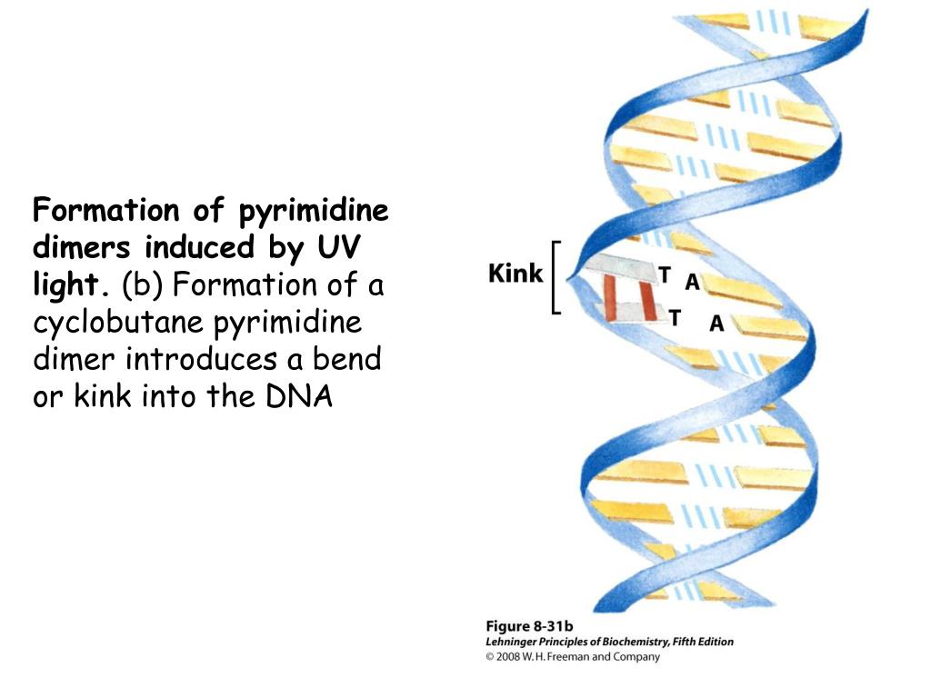 Formation of pyrimidine dimers induced by UV light. (b) Formation of a cyclobutane pyrimidine dimer introduces a bend or kink into the DNA