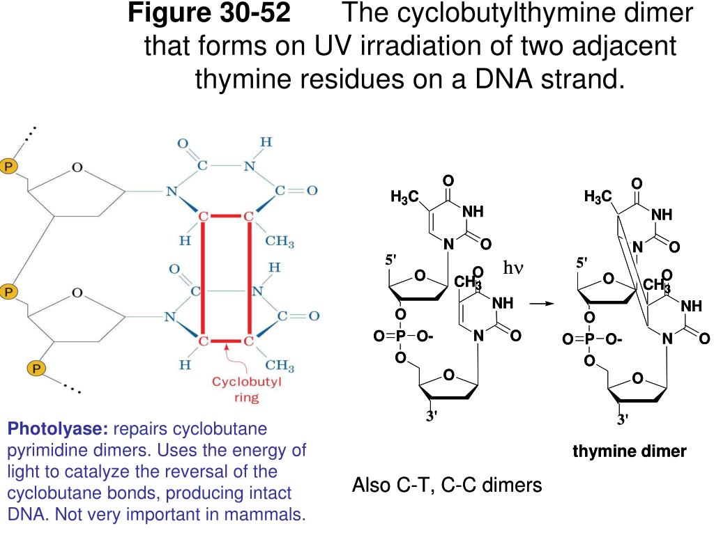 Figure 30-52 The cyclobutylthymine dimer that forms on UV irradiation of two adjacent thymine residues on a DNA strand. Photolyase: repairs cyclobutane pyrimidine dimers. Uses the energy of light to catalyze the reversal of the cyclobutane bonds, producing intact DNA. Not very important in mammals.