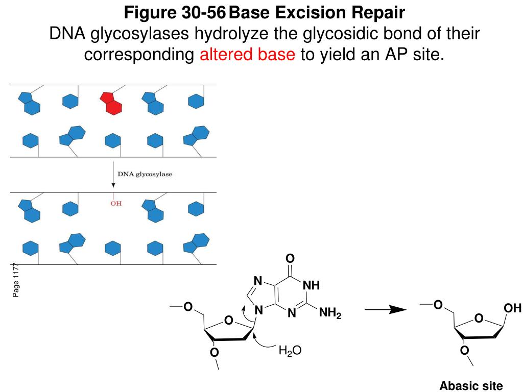 Figure 30-56 Base Excision RepairDNA glycosylases hydrolyze the glycosidic bond of their corresponding altered base to yield an AP site. Page 1177