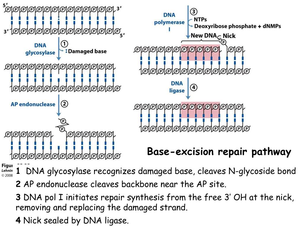 Base-excision repair pathway 1 DNA glycosylase recognizes damaged base, cleaves N-glycoside bond 2 AP endonuclease cleaves backbone near the AP site. 3 DNA pol I initiates repair synthesis from the free 3′ OH at the nick, removing and replacing the damaged strand. 4 Nick sealed by DNA ligase.