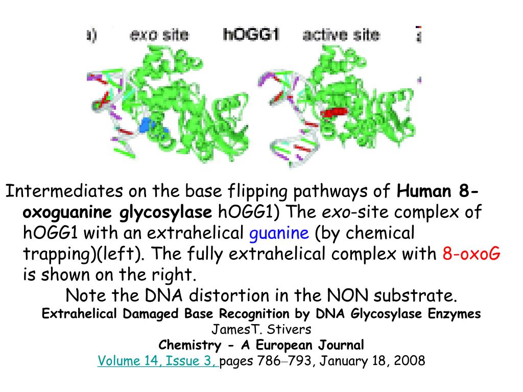 Intermediates on the base flipping pathways of Human 8-oxoguanine glycosylase hOGG1) The exo-site complex of hOGG1 with an extrahelical guanine (by chemical trapping)(left). The fully extrahelical complex with 8-oxoG is shown on the right. Note the DNA distortion in the NON substrate. Extrahelical Damaged Base Recognition by DNA Glycosylase Enzymes JamesT. Stivers Chemistry - A European Journal Volume 14, Issue 3, pages 786–793, January 18, 2008