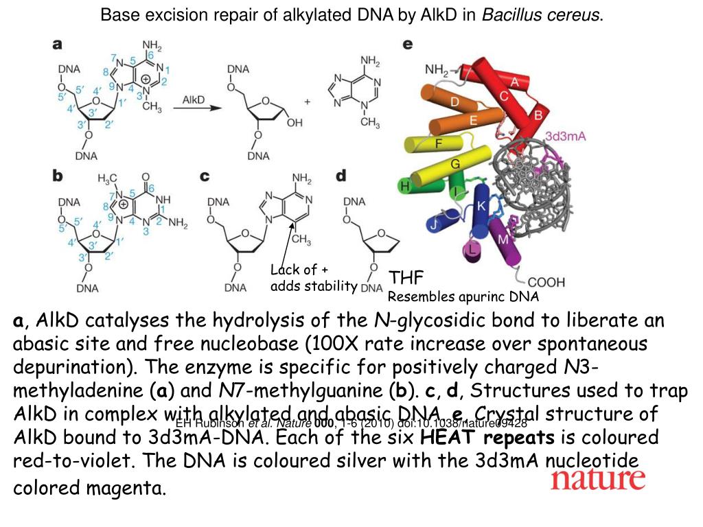 Base excision repair of alkylated DNA by AlkD in Bacillus cereus. Lack of + adds stability THF Resembles apurinc DNA a, AlkD catalyses the hydrolysis of the N-glycosidic bond to liberate an abasic site and free nucleobase (100X rate increase over spontaneous depurination). The enzyme is specific for positively charged N3-methyladenine (a) and N7-methylguanine (b). c, d, Structures used to trap AlkD in complex with alkylated and abasic DNA. e, Crystal structure of AlkD bound to 3d3mA-DNA. Each of the six HEAT repeats is coloured red-to-violet. The DNA is coloured silver with the 3d3mA nucleotide colored magenta. EH Rubinson et al.Nature000, 1-6 (2010) doi:10.1038/nature09428