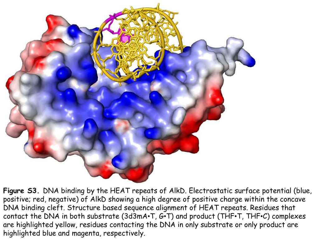 Figure S3. DNA binding by the HEAT repeats of AlkD. Electrostatic surface potential (blue, positive; red, negative) of AlkD showing a high degree of positive charge within the concave DNA binding cleft. Structure based sequence alignment of HEAT repeats. Residues that contact the DNA in both substrate (3d3mA•T, G•T) and product (THF•T, THF•C) complexes are highlighted yellow, residues contacting the DNA in only substrate or only product are highlighted blue and magenta, respectively.
