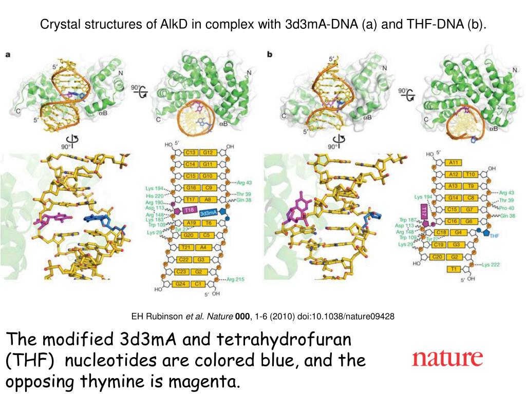 Crystal structures of AlkD in complex with 3d3mA-DNA (a) and THF-DNA (b). EH Rubinson et al.Nature000, 1-6 (2010) doi:10.1038/nature09428 The modified 3d3mA and tetrahydrofuran (THF) nucleotides are colored blue, and the opposing thymine is magenta.