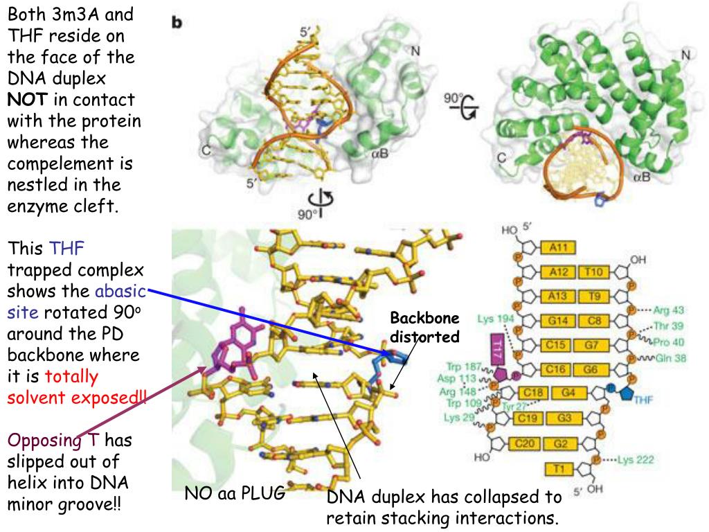 Both 3m3A and THF reside on the face of the DNA duplex NOT in contact with the protein whereas the compelement is nestled in the enzyme cleft. This THF trapped complex shows the abasic site rotated 90o around the PD backbone where it is totally solvent exposed!! Opposing T has slipped out of helix into DNA minor groove!! Backbone distorted NO aa PLUG DNA duplex has collapsed to retain stacking interactions.