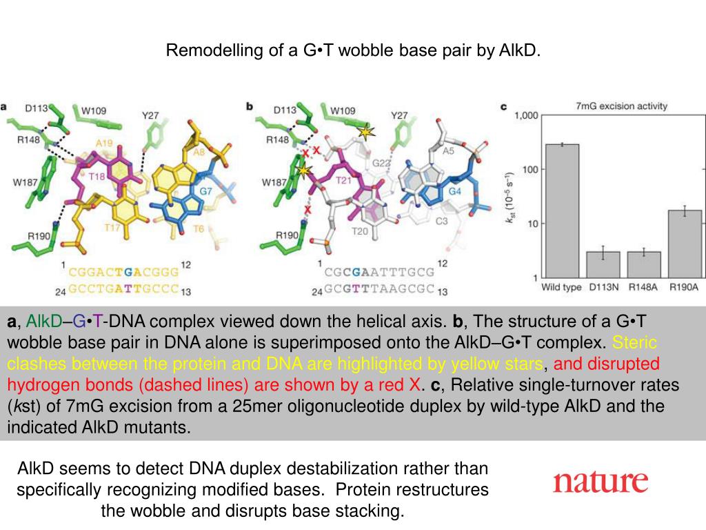 Remodelling of a G•T wobble base pair by AlkD. a, AlkD–G•T-DNA complex viewed down the helical axis. b, The structure of a G•T wobble base pair in DNA alone is superimposed onto the AlkD–G•T complex. Steric clashes between the protein and DNA are highlighted by yellow stars, and disrupted hydrogen bonds (dashed lines) are shown by a red X. c, Relative single-turnover rates (kst) of 7mG excision from a 25mer oligonucleotide duplex by wild-type AlkD and the indicated AlkD mutants. AlkD seems to detect DNA duplex destabilization rather than specifically recognizing modified bases. Protein restructures the wobble and disrupts base stacking.