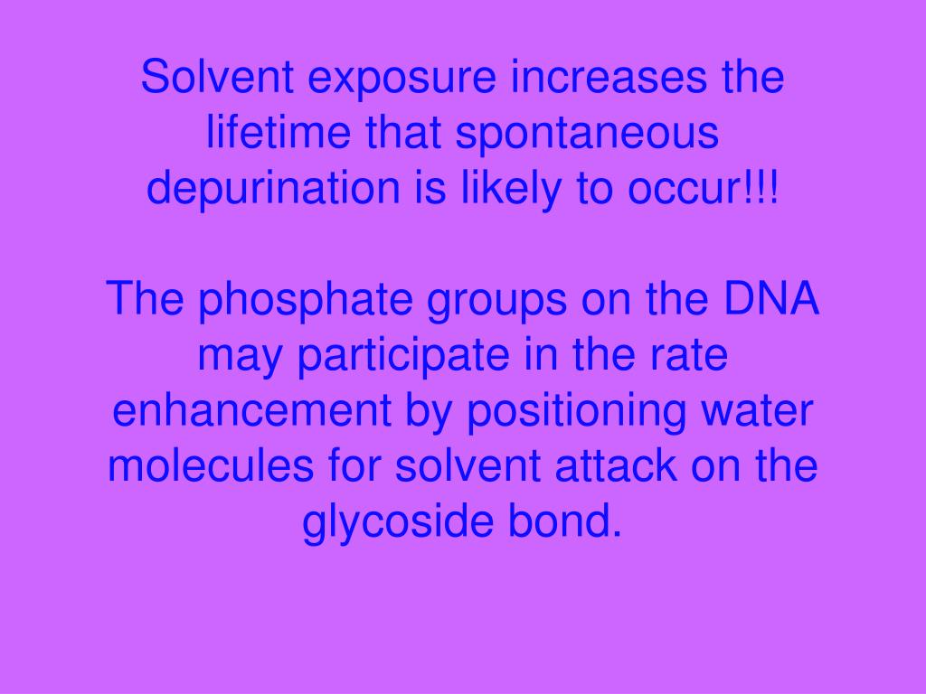 Solvent exposure increases the lifetime that spontaneous depurination is likely to occur!!!The phosphate groups on the DNA may participate in the rate enhancement by positioning water molecules for solvent attack on the glycoside bond.