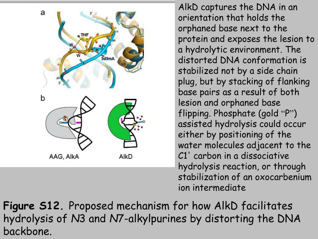AlkD captures the DNA in an orientation that holds the orphaned base next to the protein and exposes the lesion to a hydrolytic environment. The distorted DNA conformation is stabilized not by a side chain plug, but by stacking of flanking base pairs as a result of both lesion and orphaned base flipping. Phosphate (gold “P”) assisted hydrolysis could occur either by positioning of the water molecules adjacent to the C1' carbon in a dissociative hydrolysis reaction, or through stabilization of an oxocarbenium ion intermediate Figure S12. Proposed mechanism for how AlkD facilitates hydrolysis of N3 and N7-alkylpurines by distorting the DNA backbone.