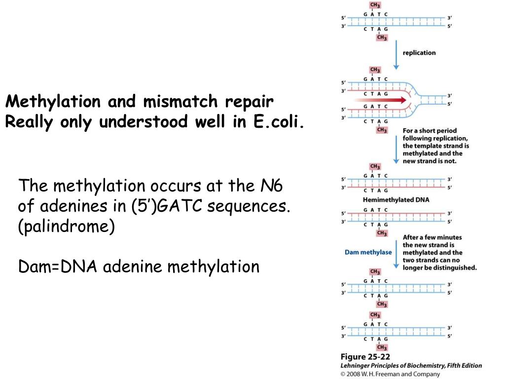 Methylation and mismatch repair Really only understood well in E.coli. The methylation occurs at the N6 of adenines in (5′)GATC sequences. (palindrome) Dam=DNA adenine methylation