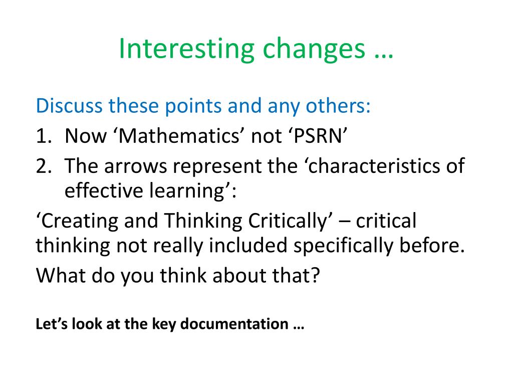 Interesting changes … Discuss these points and any others: • Now ‘Mathematics’ not ‘PSRN’ • The arrows represent the ‘characteristics of effective learning’: ‘Creating and Thinking Critically’ – critical thinking not really included specifically before. What do you think about that? Let’s look at the key documentation …