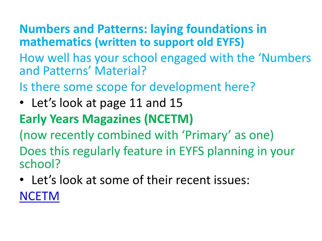 Numbers and Patterns: laying foundations in mathematics (written to support old EYFS) How well has your school engaged with the ‘Numbers and Patterns’ Material? Is there some scope for development here? • Let’s look at page 11 and 15 Early Years Magazines (NCETM) (now recently combined with ‘Primary’ as one) Does this regularly feature in EYFS planning in your school? • Let’s look at some of their recent issues: NCETM