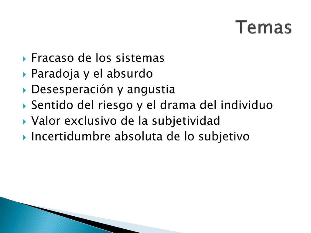 Temas • Fracaso de los sistemas • Paradoja y el absurdo • Desesperación y angustia • Sentido del riesgo y el drama del individuo • Valor exclusivo de la subjetividad • Incertidumbre absoluta de lo subjetivo