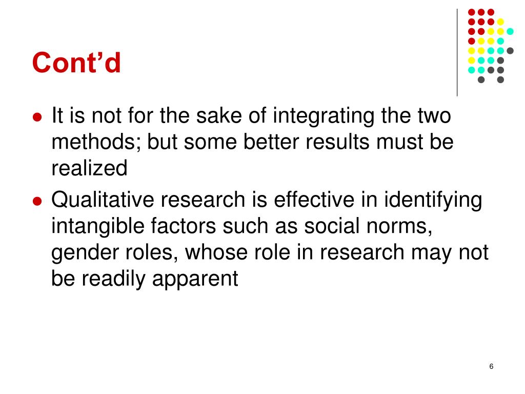 Cont’d • It is not for the sake of integrating the two methods; but some better results must be realized • Qualitative research is effective in identifying intangible factors such as social norms, gender roles, whose role in research may not be readily apparent