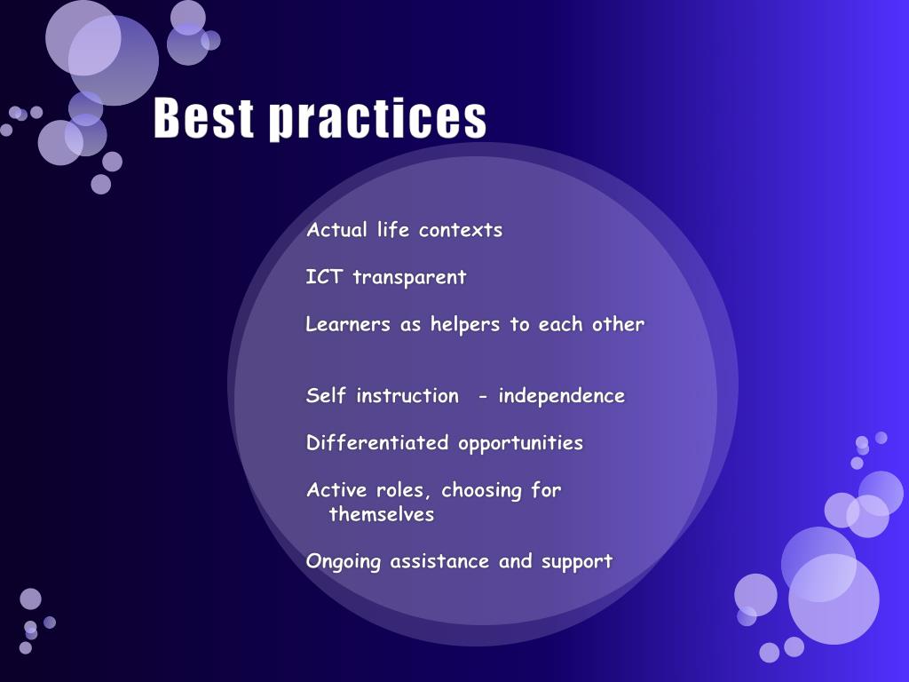 Best practices Actual life contexts ICT transparent Learners as helpers to each other Self instruction - independence Differentiated opportunities Active roles, choosing for themselves Ongoing assistance and support