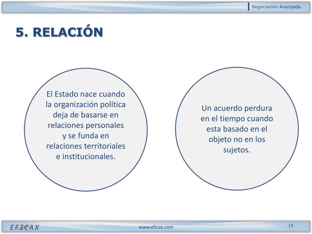 5. RELACIÓN Un acuerdo perdura en el tiempo cuando esta basado en el objeto no en los sujetos. El Estado nace cuando la organización política deja de basarse en relaciones personales y se funda en relaciones territoriales e institucionales.