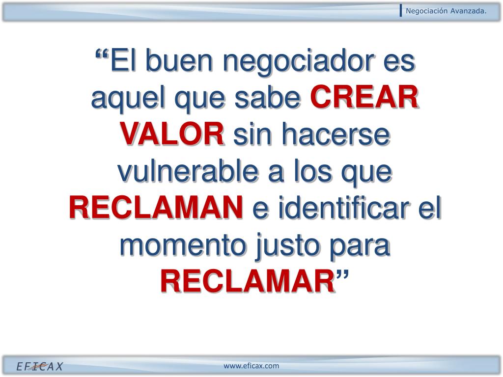 “El buen negociador es aquel que sabe CREAR VALOR sin hacerse vulnerable a los que RECLAMAN e identificar el momento justo para RECLAMAR”