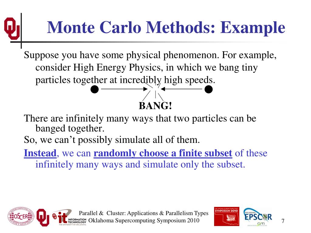 Monte Carlo Methods: Example Suppose you have some physical phenomenon. For example, consider High Energy Physics, in which we bang tiny particles together at incredibly high speeds. BANG! There are infinitely many ways that two particles can be banged together. So, we can’t possibly simulate all of them. Instead, we can randomly choose a finite subset of these infinitely many ways and simulate only the subset. Parallel & Cluster: Applications & Parallelism Types Oklahoma Supercomputing Symposium 2010