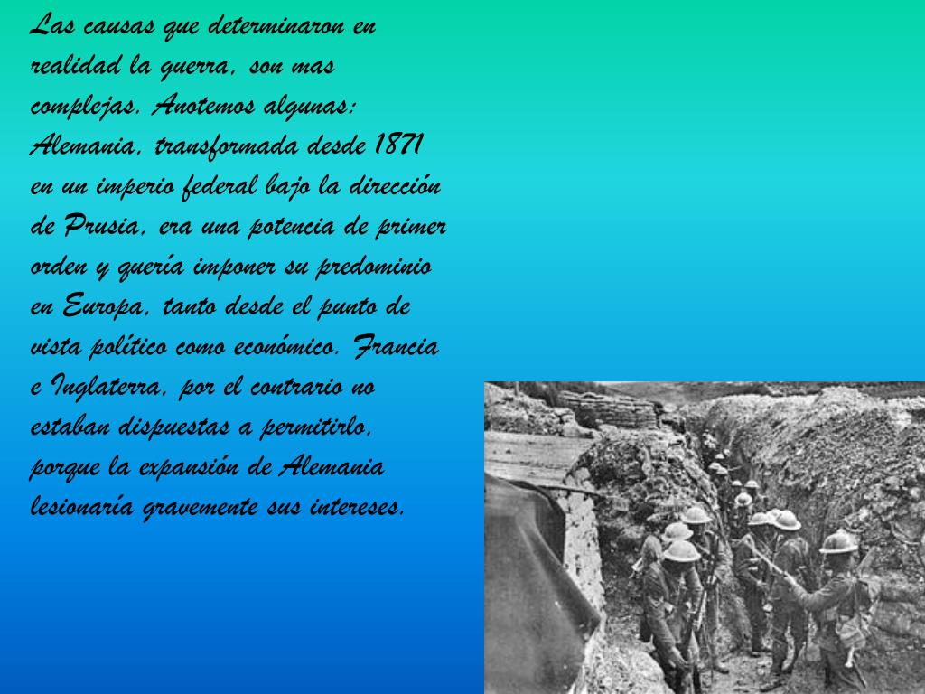 Las causas que determinaron en realidad la guerra, son mas complejas. Anotemos algunas: Alemania, transformada desde 1871 en un imperio federal bajo la dirección de Prusia, era una potencia de primer orden y quería imponer su predominio en Europa, tanto desde el punto de vista político como económico. Francia e Inglaterra, por el contrario no estaban dispuestas a permitirlo, porque la expansión de Alemania lesionaría gravemente sus intereses.
