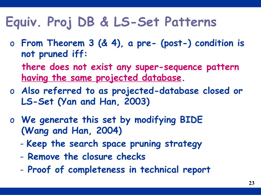 Equiv. Proj DB & LS-Set Patterns • From Theorem 3 (& 4), a pre- (post-) condition is not pruned iff: • there does not exist any super-sequence pattern having the same projected database. • Also referred to as projected-database closed or LS-Set (Yan and Han, 2003) • We generate this set by modifying BIDE (Wang and Han, 2004) • Keep the search space pruning strategy • Remove the closure checks • Proof of completeness in technical report